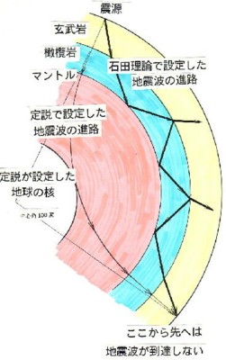 | 1153 2006-02-27 (Mon) マントルトモグラフィーが信用できない理由(続き) JBモデルでもPREMやiasp91モデルでもマントル内のP波の速度はそれほど大きな違いはありません。マントル下部では14km/sに近いとても速い速度になっています。そのような物質が本当にあるのか不思議ですが、密度から推定すれば隕石に近い物質ということになっています。 さて、地震波に関するこの分析は本当に正しいのでしょうか、この考え方は[1152]にも述べましたが地震波の走時が先へ行くほど折れ曲がってカーブを描くことに関係があります。 何故走時が先へ行くほど折れ曲がるのかというと、地震波が高速度の地殻第二層を通る時間を長く取るようになるからです。 ![]() 「地震の謎を解く」より ところが成層化したマントル内を通過すると解釈すれば、地球内部へ行くほど速度が早くならないと折れ曲がらないわけです。したがって14km/sというような高速度になってしまいますが、本当はそうではないと思います。 実際にマントル内を伝播するP波は速度が遅く、もっと後から地震計を揺らしているはずです。 |