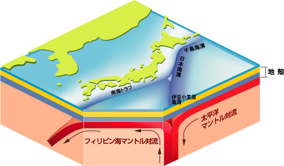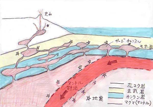 | 1158 2006-03-07 (Tue) マントル対流の二つの解釈 定説による日本周辺の三つのプレートと新しい解釈によるマントル対流という地殻の下の熔融マグマの流れを図にしてみました。 図―1は定説です。 ![]() 図―1 地球表面を構成するプレートといわれているものが地球内部に潜り込んでいます。海嶺部で誕生したときには高温ですが、大洋を移動する間に冷却され、低温になるために比重が大きくなり重い自重によって軽いマントル内部に沈んでいく(能動的マントル対流)とされています。 図―2は石田理論による解釈です。 ![]() 図―2 地殻は卵の殻のように連結し固定されていて、潜り込むようなことはありません。薄いけれども固定されているから、起潮力が作用しても変形することがなく、海水だけが移動して潮汐現象が起こっていると考えています。対流しているのは、地殻の下にある熔融したマントルです。太平洋マントル対流とは東太平洋中央海嶺(正しくは海膨)から湧き上がって日本海溝で沈んでいく(流体としての)流れであり、フィリピン海マントル対流というのは、小笠原海溝ふきんで湧きあがって南海トラフや琉球トラフで沈んでいく流れであると解釈しています。 |
