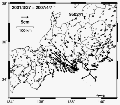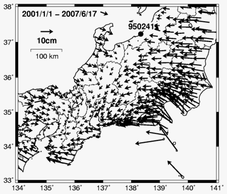 | 1264 2007-07-11 (Wed) 海底の動きは地震と無関係(2) [1252]で紹介した国土地理院発表の地殻変動とは、定常的な変動を差し引いた「非定常地殻変動」だから、今回の海保のデータと直接比較することはできないという指摘をいただきました。正味の変動量は下図のように、やはり西北に移動しているというご指摘です。