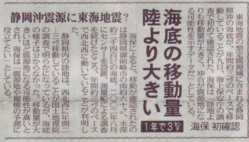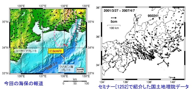 | 1263 2007-07-10 (Tue) 海底の動きは地震と無関係 東海沖の海底が年3センチ北西方向に移動していることが確認されたとの報道がありました。 何度も書いていますが、この観測結果をもって、プレートが潜り込んでいる証拠であるとする事には大いに疑問があります。([853]など) 7月9日21時38分配信 時事通信 東海地震の想定震源域に含まれる静岡県沖の海底が、年間約3センチのペースで移動していることが初めて確認された。赤い矢印が確認された海底移動。想定震源域(ピンク色)の南東端に位置する(海上保安庁提供)(時事通信社) ところで、下の図の左側は海底が3センチ移動しているという今回海上保安庁が発表したものです。 一方右側はセミナー[1252]で紹介した国土地理院のデータです。地表の動きがまったく逆になっていますが、どのように解釈したら良いのでしょうか。 セミナー内を検索していただければ分かるように、何度も書いきましたがそれは皮膚の動きから骨のがんを診断するようなものだと思います。皮膚は写真のように、微妙に北東⇔南西の動きをしているのではないでしょうか。そしてその動きは地殻(骨)の動きとは関係がないのではないかと思います。 なぜなら、地震はプレートの動きとは関係のない水素の爆発現象であるからです。