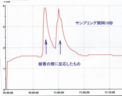 下図はセンサーに線香の煙りを近づけた時の反応を示します。人間にはかなり煙たい状況ですが、タバコとか線香の煙りにも反応しますので、純粋に水素だけの反応かどうかは、よく状況判断をしないといけないと思われます。参考のために実験をしてみました。