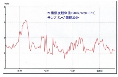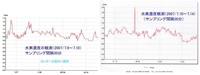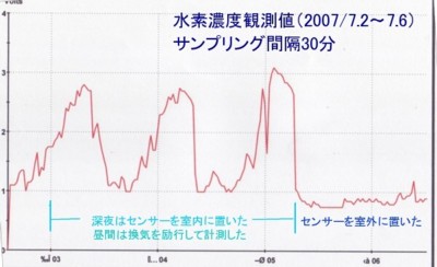 | 1261 2007-07-06 (Fri) 水素濃度の観測(2) 水素濃度を観測していますが、2日から5日まではセンサー部分を夜間は室内にセットしておりました。 5日朝からは、センサーを完全に室外に設置して計測しました。 記録を見ればわかるように、室内の濃度は生活環境の影響を強く受けていることが分かりました。 センサーを風雨に晒したくないので、昼間は換気を計ったり、室外に持ち出したりしておりましたが、今後は完全に室外にセットする方法を工夫したいと思います。 雨に当たらないようにセッティングを工夫します。