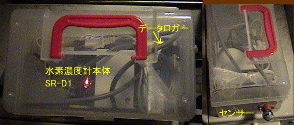 写真に示すように、プラスティック容器内に濃度計本体とデータロガーを収納し、センサー部分だけを容器から出る形式にしました。 したがって、記録はデータロガーの記録を4日程度ごとに、まとめて【ANS観測網トップページ】にグラフ表示の形式で報告したいと思います。 なお、大地震であれば4日程度あれば前兆が現れるものと思いますので、4日ごとの表示でも十分に前兆把握は可能であると判断します。 また、コンパスなど、その他の観測値に異状が現れた場合には、水素濃度も4日と限らないで、頻繁にウオッチしたいと思います。 |