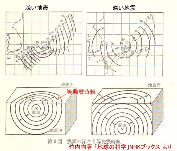 | 1343 2007-12-29 (Sat) 浅くて近い地震の記録 [1315]では浅い地震の場合、P波とS波の到達時間が理論値のようにはならないことを述べましたが、いずれも距離が10度以上の遠地地震の場合でした。 下図に示す近地地震については[1314]のA図のように、S波もP波も通常の説明でなされる理論通りに到達していることがわかります。 ![]() ![]() ![]() ![]() D図では理論と合致していないことが判りますが、合わなくなる距離は8deg(900km)前後ではないのかと思われます。 それ以上の距離になると、理論値の時間には到達しないようです。その理由、また深い地震では一見して理論値に合致するようになる理由に関しては[1317]ー[1320]及びANSビデオに解説してあります。 つまり、グーテンベルグが仮定した下図のような地震波の伝播経路は900km(震央距離)までの間では成り立つけれども、それ以上になると、地殻の下の液体マントルの存在によって仮定が成立しないことを示していることになります。 また、初期微動継続時間Tから震源までの距離Xを計算する大森公式が適用できるのも、この辺りまでということになります。