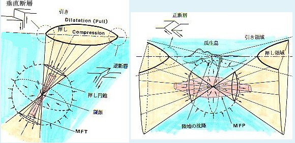 2007-12-04 (Tue) 山本氏の見解 山本氏より以下のようなコメントを頂きましたので、紹介します。回答は最後に載せてあります。 ーーーーーーーーーーーーーーーーーーーーーーー 石田先生の批判に対するコメント 2007.12.01 山本 寛 山本の考え: @ ダブルカップリングについて ダブルカップリングについては現在の地震学では次のように説明されています。 出典:http://www.kyoshin.bosai.go.jp/k-net/gk/publication/1/I-4.3.2.html ----------------------------------------------------- それでは、震源では何が起きているのだろうか。結論を言えば、地下で岩盤が急激にずれ動く断層破壊が地震の本質である。専門用語では、これを「せん断破壊」と呼ぶが、ここでは「断層破壊」という言葉を使うことにする。この破壊の衝撃によって、地震波が生成される。 断層破壊の際には、ひとつの面を境にしてその両側が逆方向にずれ動き、その結果、岩盤の中に食い違いが生じる。この食い違い面を「震源断層」という。大地震の時に出現する地震断層は、この震源断層が地表まで達したものにほかならない。 断層破壊を起こすためには、周りから何らかの力を加えねばならない。図4.3.2-1をご覧いただきたい。図の(a)は、震源断層に沿うずれの力を表し、これをシングルカップルと呼ぶ。 (b)ではこれと直交する方向に同じ大きさのずれの力が付け加わり、ダブルカップルと呼ばれる。あなたは、断層をずれ動かす力として、どちらがふさわしいと思いますか? 正解は、意外にも(b)であった。これが理論的に証明されたのは1960年代のことである。これによって、地震の本質は断層破壊であり、破壊をもたらす力系はダブルカップルである、という震源像が確立された。 (以下省略) ![]() (上記の防災センターサイトより) ----------------------------------------------------- このダブルカップリングの考えは、小生の材料力学の学力では理解できません。 現在の地震論がダブルカップリングの考えに立脚しているからこそ、これに対抗する考えを提起しない限り、新しい地震論は展開できないと考えています。 そもそもこの考えが現在の地震論を迷走させた原因ではないでしょうか? 一方、高木聖さんは、ダブルカップリングの考えが確立された?後の1970年代になっても、添付の論文(Do Earthquakes Occur due to Stress, 気象研究所研究報告第23巻第1号、昭和47年3月)のようにダブルカップリング=地震歪説を否定し続けられたのではないでしょうか? もし石田先生が、ダブルカップリングは理論的に証明されたとする文献をお持ちであり、それが正しいという立場であれば、先生のホームページ上で解説いただきたくお願いします。 A 内陸部の地下水について 海洋プレートの沈み込みに伴って持ち込まれた水が、大陸プレートの地下を駆け巡ることは、松代群発地震の例でも明らかであると思います。 勿論、雨水も地下に滲みこみますし、ダムを作れば、その水は地下に滲みこみますので内陸部でも十分地震を起こすことができると考えます。 B「ノルウェーやカナダなどで既に実用化されていて、地震など起こっていない。」のに、何故日本でだけ問題にするのか、という議論に論駁できない。について 水またはCO2を地下に注入すれば地震を誘発する可能性が高まるとする文献は沢山あります。小生はそのメカニズムについて仮説を提案しました。 ノルウェーやカナダでの実績を持ち出して、日本でもOKという論理を当局が持ち出してくれば、地震のメカニズムを議論する以前に、これらの文献を示せば済むことであると考えます。 ーーーーーーーーーーーーーーーーーーーーーーーーーー 回答 @ ダブルカップリングについて 「ダブルカップリングの考えは、小生の材料力学の学力では理解できません。」 とありますが、私もこの考えを納得はしておりません。 下図に示すように、この考え方は石本博士の押し円錐理論を二組の偶力によって解釈しようとした試みですが、物理的なイメージがまったく得られないもので、単なる空想に過ぎないと思います。ただ、押し円錐理論とダブルカップリングとは類似している部分もあるので、定説論者と討議するための接点・共通用語のようなものとして使用しているだけです。もちろんダブルカップリングよりも、「押し円錐」のほうが優れた概念だと思っています。 ![]() 「これに対抗する考えを提起しない限り、新しい地震論は展開できないと考えています。」 とありますが、対抗する考えとしては既に石本博士が「押し円錐」として提起されているもので十分だと思います。押し円錐領域とその周囲に出来る引き領域との両方を生起させる原動力が何なのかを説明することが重要になります。水素と酸素の混合ガスの爆発(爆鳴気の爆発)ならば押しと引きの発生が説明できますが、水素の核融合では説明できないのではないでしょうか。山本氏の著作(「巨大地震は水素核融合で起きる」工学社刊)では押し領域が生じるとき、その反作用として引き領域が出来