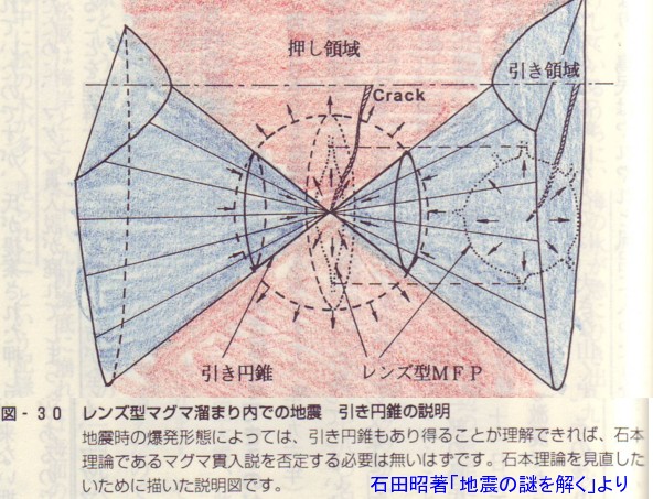 | 1333 2007-12-09 (Sun) 山本氏の見解(2) 山本氏より再度メールを戴きました。貴重な情報も含まれて居ますので全文を紹介します。 ----------------------------------------------------- 早速小生の考えをホームページで紹介いただき感謝申し上げます。 以下追加のコメントです。 @ 押し引き分布について ・小生が考えている核融合はダイナマイトの爆発のような点のエネルギーではなく、むしろ平板的なガス体です。 ・中越地震のような地質構造では、水平に横たわるレンズ型になり、それが爆発したときは上下方向に力が働き左右方向は引張られる。 これは拙著のP183に図示しました。 ・これが垂直方向になるのがP184です。 A 松代群発地震の水について これは松代群発地震地震の終わりのときに大量に噴出した水の成分が海水に近いということで、海洋プレートが一旦沈んで、それがマグマとなって上昇し、冷却されたときに水となったという説を読んだことがあり、それで説明がつくと考えます。 B「ノルウェーやカナダなどで既に実用化されていて、地震など起こっていない。」のに、何故日本でだけ問題にするのか、という議論に論駁できない。について ・ノルウェー、カナダ、アメリカ東部では、岩塩層(Saline Aquifer)に注入しているのではないでしょうか。 ・アメリカ西部では水やCO2を注入すれば地震が起きるという報告書は一杯あります。 下記をクリックしてみてください。 http://www.nyx.net/~dcypser/induceq/induceq.html ---------------------------------------------------- 以上が戴いたメール全文です。文中にある山本氏論文中のP183とP184の図も紹介し、小生のコメントも述べておきます。 回答(石田のコメント) ![]() @ 押し引き分布について 山本仮説の爆発はダイナマイトのようなものではなく、平板的なガス体の爆発であると述べておられます。 石田仮説では下図に示すようにマグマの流れる管路のどこかに蓄積されたガスが爆発すると考えていますが、爆発の方向に関しては管路と直角方向なのかもしれません。ガス体の形状と爆発の方向などの詳細な話に関しては専門外ですのでよくわかりません。 ![]() 実は、石本博士の押し円錐理論が廃れてしまった理由の一つが、地上に現れる押し引き分布の形状が、押し円錐理論から推定されるものとは違った形状、つまり円錐内部が「引き」になり、外部が「押し」になるケースがあるため、ということです。 それだけで、「押し円錐理論」を捨てることは科学的ではないと思います。そこで、場合によっては山本氏が考えておられるようなレンズ型形状のマグマ溜りにガス体が形成された時には、押し引き分布が「逆」になって「引き円錐」になるケースがあるかもしれないと考えたのが、拙著「地震の謎を解く」(P110)にある次の図になります。 ![]() 果たして、マグマ溜りの形状によって爆発の様子が変化し押し引き分布が「逆」の「引き円錐」になることがあるのかどうかは、まだよくわかりません。爆発問題の専門家の知見を戴きたいところです。 A 松代群発地震の水について 確かに温泉でも塩分濃度が高いところがありますが、「海洋プレートが一旦沈んで、それがマグマとなって上昇し、冷却されたときに水となった。」という説には納得できかねます。松代付近でのプレート深さがどの程度か知りませんが、少なくとも何十キロという深さで摩擦熱によって誕生したマグマがどのように上昇するのか、そのメカニズムが想像できません。 日本は火山帯にありますから、マグマも浅い部分にあるはずですが、そのマグマはプレートの摩擦で形成されるのではなく、依然としてマグマオーシャンである地球内部の熔融マントルが地球冷却の過程で形成されたマグマの流れる管路内部を上昇してくるのであって、プレート論とは無関係な存在であると思います。 現在は「陸」となっている場所でも、数万年前、数億万年前には、「海」の底にあったわけですから、浮上して「陸」になったときに、塩水湖がいたるところに出来たはずです。それが干上がってしまったのが、岩塩となり、長い年月の間に起こる地殻変動で地中に埋没しているケースは沢山あると思います。地下水に塩分が含まれる場合があるのは何も不思議なことではないと思います。プレートが潜り込んでいる証拠だとは私にはとても思えません。 Bノルウェーやカナダなどで既に実用化されていて、・・・何故日本でだけ問題にするのか、という議論に論駁できない。について 実用化されている国では岩塩層を選択して注入しているのかどうか、情報がありませんのでわかりません。 山本氏の見解では「岩塩層ならば金属が存在しないので、原子水素が発生することがない、このことが外国の例では地震が発生しない理由だろう」ということだ思います。 しかし、では日本の場合にはなぜあのように激しく余震が起こるのか、という理由を説得するには効果が薄いように思います。たとえ金属と反応するとしても、あれほど何回も同じ地