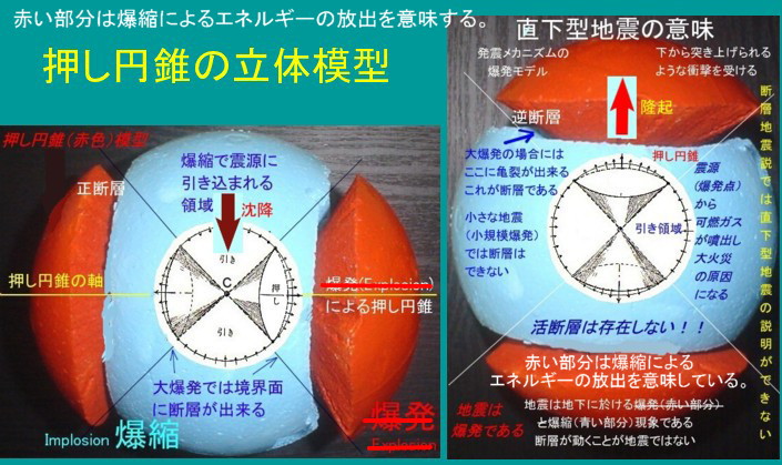 | 1382 2008-03-30 (Sun) マグマ貫入理論の変遷 このセミナーの読者には地震学を専門的に学んだことがない方も多いのではないかと思います。しかし、地震現象を正しく把握したいから勉強しようとしても、最近の解説書には「マグマ貫入理論」に関してほとんど説明がありません。死語に近い存在になっています。 そこで、参考の為にニューオフィスに「62マグマ貫入理論の変遷」を追加しました。 「地震のはなし」浜野一彦著 鹿島出版会1986年発行 「地震百年」 萩原尊禮著 東京大学出版会1982年発行 「地震の科学」笠原慶一著 恒星社 1959年発行 の三冊から、抜粋して紹介しておきました。 註1に少し解説しましたが、地震は自然現象ですから、地下深部での爆発情況によっては、押し円錐的な爆発にならないケースも当然あると考えられます。セミナー[1333]に紹介した押し領域と引き領域とが逆転する「引き円錐」のケースなどもその一例です。 ガスが貯留するマグマ溜りの形状によって、爆発のバリエーションは幾通りもあると考えられます。 註2にあるように、深発地震の場合に象限型分布が見られるという理由に関しては、ニューオフィス48に解説してあります。 深発地震の起きる原因が定説では物質の相転移による体積の急激な減少であるとされていますが、そのような現象で衝撃的な地震が発生するとは思えません。 [1359]で述べたように、熔融マントルが対流することによって、マントル物質に含まれる水の解離度が変化します。そのために起きている爆発であると考える方が合理的であります。 地殻内部で起きる浅い地震と違って、熔融マントル内での爆発ですから、解離ガスの貯留状態はバリエーションが少ないと思われます。マグマ溜りの形状に左右される浅い地震とは違うのだと推定されます。 註3に述べたように、全ての地震が象限型で表示できるということですが、直交する二つの節面のどちらが断層面なのかは分からない・・・ということですから、現在の地震観は物理現象としては分かり難い曖昧なものになってしまっています。 「地震初動の押し引き分布は基本的には押し円錐的な爆発領域とドーナッツ・リング状の爆縮領域とで構成されるが、ガス溜りの形状によっては異例なケースもある。」 と云う解釈の方が物理的イメージが明確であるのは確かです。 因みに、押し円錐の立体模型を載せておきますが、軸が鉛直に近い場合が直下型地震で、水平の場合には、都市の直下で起きる地震であっても直下型地震とはなりません。定説では都市の直下で起きる被害の大きな地震・・・と云うような曖昧な定義になってしまいます。 ![]() 追記: [3142]に爆発理論の修正(シンプル化)が載っています。 |