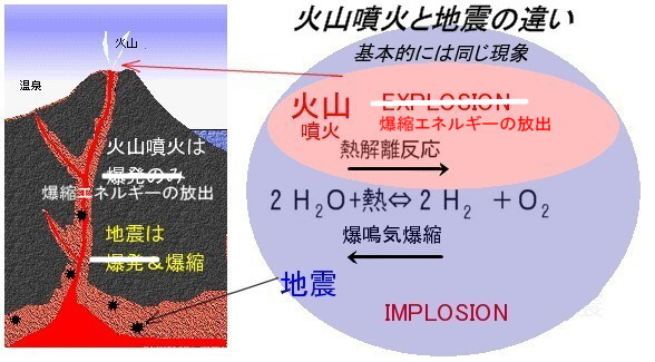 | 1375 2008-03-14 (Fri) フンボルトの地震観(火山噴火と地震は同じ現象) 現代の科学では、地震の原因と火山の噴火とは全く別の現象であると考えられています。 地震は断層が動くことが原因で、火山はマグマが関係している爆発現象が原因とされていて、まったく別物として扱われています。 セミナー[1287]では「マグマが直下にある場所は地震が発生しやすい」という東北大学の研究発表を紹介しましたが、これは断層地震説を否定するのと同じことであり、断層地震説一辺倒の学会で発表するには勇気が要ることだと思います。 今では殆どの研究者が断層が動くことが地震であると信じていて、マグマ貫入理論は死語になってしまったようですが、大正の終わりから昭和の初頭に掛けては、そうではなかったのです。 ところで、石本博士のマグマ貫入地震論や、押し円錐理論は小川博士の地震観からヒントを得て構築されました。その小川博士は「須らくフンボルト所説に復帰すべき」と提唱されたように、フンボルトの主張である「地震現象と火山噴火は同じ現象である」という見解を強く支持しておられました。 石田理論も当初から火山噴火は地表の浅い部分で起こる爆発現象で、地震の第一段階だけで終了するものと考えていました。 第一段階とは次のような解説になります。下に示す模式図と[1367]の解説をも参考にしてください。 ![]() 第一段階:水が酸素と水素に解離することに伴って起こる爆発的反応、あるいは解離反応が液体から気体へと「水蒸気爆発的」に反応するのかもしれませんし、ボイラーの爆発で知られている「平衡破綻型爆発」というマグマ溜りの破壊現象などの可能性もあります。いずれにしても、Explosionという膨張する爆発で発生します。 一方の地震現象はその後で起こる第二段階の爆縮をも伴うものと考えています。 第二段階:解離した酸素と水素が再び結合して水に戻る爆縮現象に伴って発生します。解離した「解離水」(石田研究所の命名です)はモル数が減少しますので、気体⇒液体という現象でなくとも、体積が減少する爆縮(Implosion)です。「水蒸気爆発的反応」の逆が生じて、気体⇒液体が起きていれば縮小率ははるかに大きくなります。 火山の噴火というのは、此の第一段階の爆発で上部のマグマが噴出するので、天井が吹き飛んだ状態になります。したがって、結合反応が空中で起こることになります。 噴火時に見られる熱雲とか火砕流と云うのはその内部で水素と酸素の燃焼が起こっていて高熱になっているのではないかと思います。雲仙普賢岳の火砕流でもありましたが、冷却されると泥混じりの降雨があるのはこの結合水のせいでしょう。([102][104][539]参照) 地震は地下深くでの反応ですから、上部の天井(地殻)を跳ね返すことが出来ません。高圧力下での反応ですから、地表には震動しか伝わりません。ただし、大規模な反応ですと、押し引きの境界に傷痕としての断層が生じます。 地震の規模は断層の大きさ、つまり面的なもので決まるのではなく、解離するガス量によって規模が決まります。 以上のように、地震現象の原因として地球内部の水が演じる爆発力を導入すれば、フンボルトの洞察は理論としての有効性を持ってくることは確実であります。 「マグマ貫入理論」という地震爆発説が否定されてしまったのは、[1367]でも述べましたが、「爆発ならば初動の押し引きが全て押しになるはず」という誤解からです。 地震現象とは爆発と爆縮と云うセットで起きる化学反応であるという認識の下に、今一度フンボルトの洞察に戻って地震現象を吟味して欲しいと思います。 石本博士の次の言葉は私も信じております。 『近き将来においては博士の卓見に対して再び驚嘆する時機の到来すると同時に、同説の根本に対し左袒するものの益々多きを加える事は信じて疑わぬものである。』 左袒:(さたん) <史記に出ず>左のかたを脱ぐこと、転じて加勢すること。賛成すること。 追記: [3142]に爆発理論の修正(シンプル化)が載っています。 |