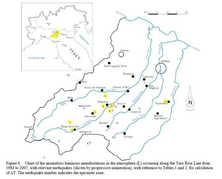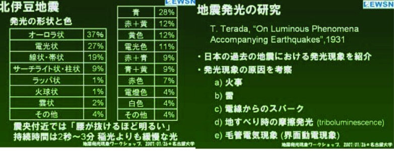 | 1387 2008-04-21 (Mon) イタリアでの地震前発光現象 【事実を、正確に、総合的に、あるがままに見よ】・・・というのは、湊正雄先生の言葉([1384])だそうですが、地震現象に関しては発生メカニズムがよくわからない「事実」がたくさんあります。発光現象もその一つですが、発光の形態にも様々な違いがあります。 このセミナー([1295]など)でも紹介したペルーの地震や有名な松代群発地震で見られたのは、巨大な水銀灯が点灯したようなものですが、空中に光の球が浮かぶような現象もあります。 セミナー([1297])でも紹介した「地震発光現象ワークショップ」のなかで、中部大学の井筒潤氏が北伊豆地震で見られた様々な発光の形状を分類して図のように示しておられます。 ![]() この分類のなかにある火球状という現象が、イタリアでも観測されていることが、NCGTのニュースレター[44]にあります。日本語版はこちら。 イタリア北西部に位置するアペニン山脈のTaro川渓谷沿いには地震の多発地帯があって、地震発生のかなり前(45日以上)に、震央近くで火球が現れるそうです。 抜粋して紹介します。 ----------------------------------------------------------------------------------------- ―イタリア、北西アペニン山脈 Taro渓谷― Valentino STRASER (山内 靖喜・矢野 孝雄[訳]) Taro渓谷地震帯は“Taro線”として科学界に昔から知られていた。浅発地震が定期的に発生するのが特徴である。普通30kmより浅く、平均10kmのことが多い。 ![]() 図6 1983年から2007年までにTaro River Lineに沿った地域で起きた大気中での異常な発光出現(L)とそれに関連した地震(1〜13の数字で示してある)の地図。 この数字は凾sの計算のための表1と表2の数字に対応する。地震の数字(1〜13)は震央を示す。 大気中の発光現象は、普通Taro川の主に中流域、Solignanoとそれに隣接する地域の渓谷に沿って観察されてきた。これらの際だった特徴は、活動している時期と休眠している時期とが、不規則だが交互に繰り返し、色とりどりの光の通る小道と球が見られることである。これらは、普通、地震の数週間あるいはそれ以上前に、地面直上あるいは数m上に発生する。 いろいろな色あるいはしばしば白色の光球は、数cm−1mの大きさである。地面に近接した他の発光効果は、回転楕円体あるいは非常にまれだが尾を引いていたり、光るあぶくのようだったり、“閃光”のような形をしており、数秒あるいは数分間大気中に浮かんでいる。移動するときに音は発生しなかったと報告されたが、若干の速度を持っていた。最近起きた例の一つを図2に示した。 ![]() 図2 Langhirano(Parma イタリア)において、地震(M=2.9 深さ12q)発生の五日前の2007年8月10日の発光現象。 この写真は、2007年8月15日のGazetta di Parmaに発表された。 Taro系における前兆信号 地震の発生は、その広域性、すなわち単に個々の分離した出来事ではないいくつかの物理現象の連鎖と考えられるべきである。このような考え方から、前兆信号―電磁気的・化学的、および、そのほかのもの―は、地震固有の特徴と理解すべきである。(後略) Taro系の特色は、異例な発光現象が起きることである。それは地震のかなり以前に(45日以上)、その震央からある距離を離れて起きるが、まれに震央帯と一致する。 これは、世界の別の場所で観測された地震蒸気(Shou 2006)や先震動発光現象(St-Laurent et a1. 2006)と対照的である。それにもかかわらず、本論で検討する地震の前兆信号は発光である。この現象は、大地ポテンシャルの変動、電磁気学的放射と電離層での乱れ、あるいは、それらのいずれかによる結果とされ(Freund 2002)、地震の兆候としてすでに別の著者達によって証明されている。 研究地域、とくにPo川渓谷で行われた地震探査は、大陸地殻とマントルの不連続(モホ面)が深さ30-40kmにあることを示した(Ghelardoni 1994)。浅部に発達したテクトニック応力(これらの例では、震源の深さはまれに30kmを越える)は、熱勾配に影響を与え、発光現象の発生に有利な応力場をつくる。 (前略)テクトニック応力は途方もなく大きな岩石に作用し、通常は地震に先行して内部断裂と微小割れ目を作る。電荷担体が生成し、それらは岩盤内を浮動する。これらの後者の低い運動衝突エネルギーの形態は、応力を受けた岩盤中の微小割れ目で活性化し、その後、地面で活性化して大地と大気の境でコロナと発光現象の両方、あるいは、いずれかを起こす(Freund 2002)。 陽電気を荷電した担体集中が臨界にたっすると、岩石から噴出し、雲状に広がった固体状態のプラズマに取って代わられる。それは地面を横切るため、不伝導性が失われ、発光と高周波の放射を伴ってコロナ荷電を引き起こす。電気的な荷電担体は大気にも影響を与える(St-Laurent et a1. 2006)。 室内実験によれば、花崗岩、斜長岩、はんれい岩のような磁性をもつ岩石が応力を受けると、自家発生電流が生じて電池として作用する。これらの瞬間的で一定しない電流は低周波の電磁気学的放出を伴う地震と関係ない前兆を検出するの
