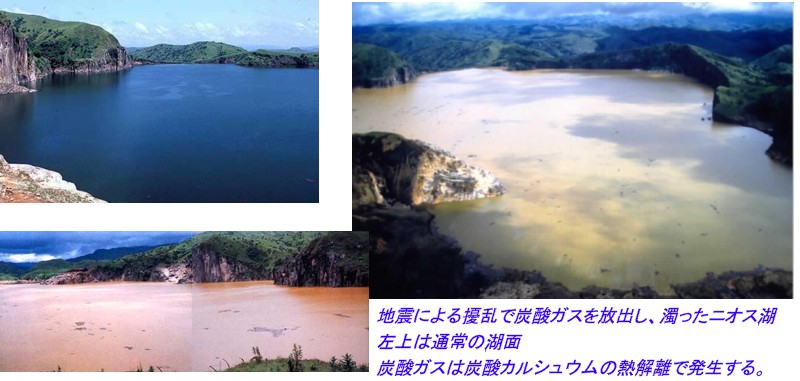 | 1390 2008-04-28 (Mon) ニオス湖事件の真相 日経サイエンス2000年10月号に「致死性ガスを噴出する危険な湖」と題して、ニオス湖の湖底に貯留した二酸化炭素のガス抜きを実施するという報道がありました。(購読有料) カメルーンにあるニオス湖では、1986年に地震と同時に高濃度の二酸化炭素が噴出し、1700人の命が奪われるという悲惨な事件があり、その後もガス噴出の危険性があるために、これを湖底から抜き去ろうという工事であります。現在は写真で見るように、高さ40メートルもの噴水が吹き上げ、湖底のガスを抜いているそうです。 ![]() http://www.geol.sci.hiroshima-u.ac.jp/~environ/mysite1/cameroon.htmlより 日経サイエンスの記事の一部分を紹介します。 ーーーーーーーーーーーーーーーーーーーーーーーーーーーーーーーーーーーーーーーーーーーーーーーーー (カメルーンにある)ニオス湖は約500年前の火山の爆発でできた火口湖で、火口の地下には冷え固まったマグマがある。水深は210mに達する。このような湖は、世界中の火山地帯に見られるが、実際にガスを噴出して人命を奪ったのは、ニオス湖とマヌーン湖だけだ。マヌーン湖は、ニオス湖の南東95kmにある。 静かな湖が突然に“爆発“ 地底の火山活動で生じた二酸化炭素(C02)ガスは上昇して、湖の下にある地下水中に溶解し、ミネラル成分と一緒にニオス湖の湖底に入り込む。ガスの溶けた水は、上部層の淡水とは混ざらずに深層部にたまる。火口湖では、ほとんどの場合、季節変化に応じて定期的に湖水の循環が起こり、深層水にガスが溶け込んでいる場合もガスは大気中に拡散してゆく。だが、ニオス湖とマヌーン湖では循環が起こらない。 化学躍層と呼ばれる層が、ミネラル成分を多く含んだ底層と上部の淡水屑とを隔てている。ルワンダとコンゴ民主共和国の国境にあるキブ湖でも同じ構造が見られるが、ガスが噴出したという記録はない。 このような湖では、湖底の水はC02が飽和状態になる。何かのきっかけで、湖底の水が上部に移動を始める。その引き金になるのは、強風や嵐,異常低温による上層水の沈降、地滑り、地震かもしれない。底層水が上昇して圧力が減少すると、C02は溶液から泡となって水面に出てくる。泡に引きずられて、湖底の水がさらに引き上げられる。 この運動には勢いがついて数個の泡が大きな流れとなり、ちょうど栓を抜いたシャンパンのように、ガスを含んだ水が噴水のように噴き出てくる。ニオス湖の場合では、この噴水流の高さが80mにも達し、C02が湖面上の大気に充満した。 C02は、空気よりも約1.5倍重いので、地面に沿って動き、通り道にあるすべてのものを窒息死させてしまう。 ーーーーーーーーーーーーーーーーーーーーーーーーーーーーーーーーーーーーーーーーーーーーーーーーー 以上です。 この事件に関してはセミナー[230]でも述べましたが、【この時、地震・竜巻・洪水などの自然災害を裏付ける傷跡は見られず、死者の多くは寝ているままの即死状態で家屋にも損壊した跡はなかった。】という情報は間違っています。家屋に損壊が無いのに家畜や人間が即死状態だったというのは正しいのですが、事件は地震によって起こった湖底の擾乱でガスが噴出したもの、または地震そのものが、炭酸ガスを大量に発生させる可能性があるのです。セミナー[230]では、 「炭酸カルシュウムの熱解離現象から地震が起こり、かつ噴出してきた炭酸ガスによってニオス湖の惨事は起こったのだと思います。湖の底近くにラムネ水のような炭酸水が大量にあって、それが地震時の衝撃で急激に発泡したのだという解説ですが、天然のラムネ水が湖底近くで自然の作用で出来たとは考えられません。」 ・・・と書きましたが、現在進行形でガス貯留が継続しているのなら、炭酸カルシュウムの熱解離現象が火山活動の一つとして、常時起こっている可能性があります。 『また生き残った住民の証言によると、卵の腐ったようなにおいがしたとか、のどや肺をガスでやられたという話があり、またかなりの人が火傷を負い、その中には着ていた衣類は焼けていないのに、からだに火傷を負っている例もあった。ガスと汗が反応して火傷を招いたのであろう。 これらの点からみると、二酸化炭素のほかに、硫化水素や亜硫酸ガスが混在していた模様である。 これは、ニオス湖の湖底でなんらかの火山活動があったことを示唆しているように思える。 大量の二酸化炭素は、もともと湖底近くの水中に溶け、高い水圧のもとに封じこめられていたものと考えられる。たぶん湖底下からの慢性的な火山活動により、ガスが水中にしみ出し、蓄積されていたのだろう。』(伊藤和明著「火山噴火予知と防災」岩波ブックレット) とあるように、湖底を火口とする火山の爆発によって噴出したガスと見るのが正しいと思います。「ガスと汗が反応して火傷を招いたのであろう。」・・・とありますが、常温のガスが噴出したのではなくて、火山活動に伴う火