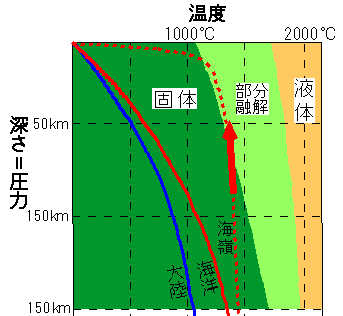 | 1371 2008-03-06 (Thu) 地震岳登山の間違った道標[その2] マントルが熔解しているという見解に対しては、かつて大学院生の方から質問をいただきました。(セミナー[872]参照) 核とマントルの境界付近のマントル下部物質が固体であることは実験が証明しているというもので、要点は以下のようなものでした。 ・ 下部マントルはペロブスカイト(MgSiO3)で構成されていると考えられている。 ・ 深さ1000kmに相当する30GPaの圧力の下でペロブスカイトの融解実験をすると、融点が4000度であった。 ・ 融点は圧力が高くなると上がっていくから、マントル最下部(2900km)の高圧力下では当然ペロブスカイトは固体である。 私は回答として、以下のように伝えました。 ・ マントルがペブロスカイトという物質であるとは思えない。 ・ マントル物質は火山から噴出するマグマと成分において大差の無い物質で、地球内部を対流するのに応じて水の状態が変化しているだけだと推定する。 ・ つまり浅い部分では結合水が多く、深部では解離水(酸素と水素の混合ガス)の状態になっている。これが海嶺や海溝で地震が発生する理由である。 ・ そのほかに、大地震のあとではお寺の鐘のように長周期の震動が観測される。内部が流動体である証拠である。 ・ 地球に磁場が存在するのは、マントルが流動しているからである。固体ならば磁場は発生しない。 以上のようにお答えしました。 マントル物質がペブロスカイトであると推定されているのも、地震波の伝播速度から決めているのですが、何度も云うように、地震波の伝播経路に大きな誤解がありますから、マントルがペブロスカイトであるという説も正しいとはいえません。 ここでこれから、吟味しますがマントル固体説でさえ間違っている可能性が高いのです。 また、ペブロスカイトの融解実験というのは、固体のペブロスカイトが何度で融解するのかを見ているだけです。地球内部では解離状態と結合状態との水を大量に含んでいる可能性があります。 水を含む場合には物質の融点は劇的に下がることは笠原先生の研究から明らかになっています。(セミナー[702]参照) 解離水や、結合水を含むマントル物質は4000度と云う高温下では、どのような岩石で構成されていても、融解している可能性のほうがはるかに高いはずであります。 地震波の伝播経路に間違いがある、マントルは液体である、と主張したら、この後の議論はかみ合わないですから、ひと先ずここは固体であるとして、定説の内容を吟味してみる事にいたします。 定説では固体であるマントル物質から、マグマができるのは以下のような二説があります。 @ プレートが潜り込むときのプレートどうしの摩擦熱によって融解点に達する。また、プレート境界では水が存在するので融点が下がっている。 A 深部から表面近くに浮上すると、圧力の低下によって融点がさがる、それで融解する。 @ の説だと[1364]の下段右図のようになりますが、プレートの摩擦と云う考え方は寓話に近いもので、さすがに最近では採用しない人が多いようです。 地学教室と云うサイトにあるマグマの発生論を抜粋して紹介します。 http://georoom.hp.infoseek.co.jp/7old/3litho/21magma.htm ―――――――――――――――――――――――――― マントルはカンラン岩、つまり固体 「マントル=ドロドロと融けたマグマ」と言ったイメージが持たれがちですが、これは完全な誤りです。マントルは、多少軟らかくなっている部分があるとは言え、あくまで固体です。マントルは主にカンラン岩からできています。図1はカンラン岩が、どのくらいの温度・圧力のもとで固体(岩石)であるか/液体(マグマ)であるかを示しています。水などの純物質と異なり、岩石のような混合物は、融け始めと融け終わりの温度に幅があります。その中間にある融けかかった状態を部分融解と呼び、図1ではを黄緑色で表しています。ところで物質の融点は、温度だけでなく、圧力にもよるので、黄緑色のゾーンが右斜め下に向かっていることに注意してください。さて、地球深部に行くにつれ、温度・圧力は図の青線・赤線のように上がってゆきます。つまり地球深部にでも、カンラン岩は固体のままです。このグラフは地下150kmまでしか表していませんが、マントル深部でも事情は同じです。つまりマントルは高温であるが、圧力も高いので、あくまで固体なのです。 ![]() 図1 カンラン岩の状態(液体−固体)と地下の温度・圧力の関係 岩石は混合物なので、固体と液体の間に部分融解(融けかかった状態)の領域がある。地下深くに行くと圧力が大きくなるので、物質は融けにくくなり、融点は上がってゆく。 一般的な大陸地域(青線)、海洋地域(赤線)の地下では、深さ(圧力)の割に温度が低く、カンラン岩(マントル)は固体のままである。海嶺のように、高温のマントルが上昇してくるところでは、岩石は熱伝導しにくいので高温のまま圧力だけが下がる(赤矢印)。ついに黄緑の領域に入ると部分融解
