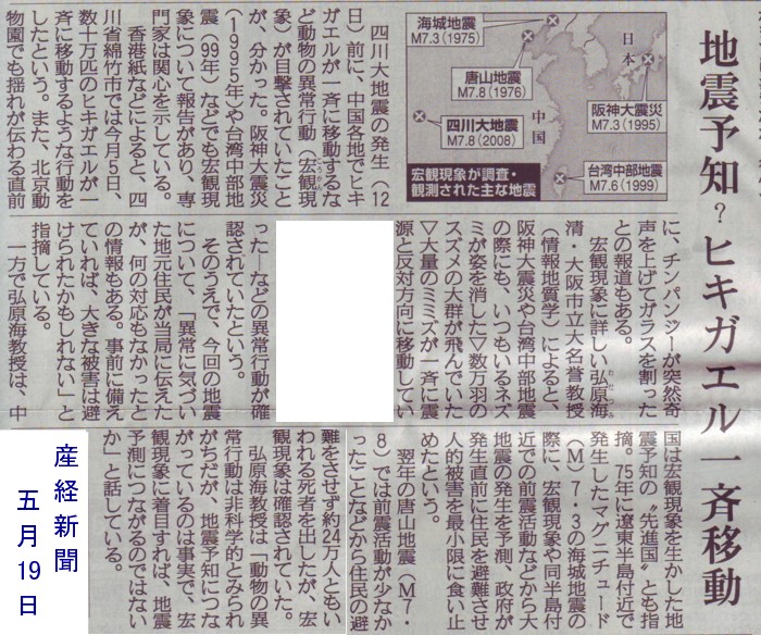 | 1406 2008-05-19 (Mon) 今こそ地震観の切り替えが必要 宏観現象として蛙[1400]が綿竹市でも大移動したというニュースが今朝の産経新聞に載っていました。 ![]() 専門家は関心を示していると書いてありますが、地震のメカニズムを専門とする地震学者は別でしょう。このシーズンには別に珍しい光景ではない、地震と関連させるのは「非科学的」として無視されてしまうのではないでしょうか。 海城地震で予知に成功したのは[1397]で述べたように、周恩来首相の決断で体制を作ったからですが、唐山地震で失敗し、頓挫してしまいました。原因は納得できる地震観が存在していなかったからです。地震に伴う多くの現象を納得させる地震観が必要です。 今回の大地震を契機にして「断層地震説」あるいは「プレートテクトニクス仮説」から「地震爆発論」へと地震観をシフトする必要があると私は考えます。 |