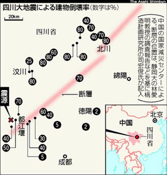 | 1427 2008-06-11 (Wed) 断層は爆発破壊で自由端になった場所 昨日談話した元大学教授も、「建物被害は確かに断層線の上に並んでいる」と語っておられました。 構造関係の研究者ですが原因と結果の因果関係を取り違えておられるように思いますし、四川地震に関しても因果関係を取り違えた報告・報道がありますので、紹介しておきます。サイト上では記事が消えてしまうことが多いので、あえてお叱りを覚悟の上で転載します。 ーーーーーーーーーーーーーーーーーーーーーーーーーーーーーーーー http://www.asahi.com/special/08004/TKY200806020147.html 断層近くで建物倒壊率8割も 中国が衛星画像分析