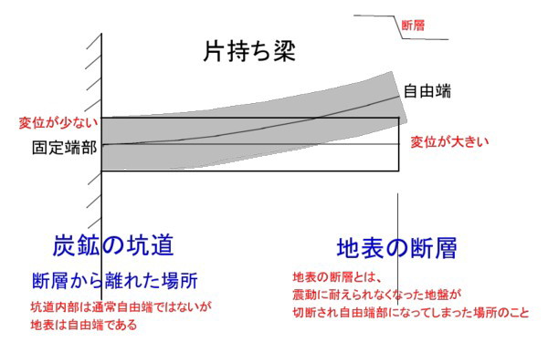 ![]() 専門用語を使えば片持ち梁の端部のように、支持がない自由端では支持のある固定端よりも変動が大きくなるのは当然です。したがって構造物ではなるべく固定端・支持部があるようにラーメン構造にして被害を少なくするわけです。 唐山大地震でも炭鉱労働者は坑道から無事に生還していますが、地下深部の炭鉱が地上より破壊が少ないのは、坑道が自由端部とならないためです。地下深部に巨大な鍾乳洞のような空間があれば別ですが大抵は地表のような自由端部ではないからです。 地表の断層とは大きな震動によって、地盤の耐久力がなくなり、鉛直方向と、平面方向の二重に渡って自由端になってしまったわけです。その上に載っている建築物の被害が大きくなるのは当然であります。 つまり、地球内部方向への鉛直と平面的な広がりの両方向に自由端になってしまった地盤の傷痕が断層であり、その周辺で被害が大きくなるのは当たり前であるということであります。 近くに活断層が走っているという情報を聞いて、脅えている住民も多いようですが、断層付近で建物被害が大きくなるかどうかは、断層という傷痕が再び地表面上で自由端になるかどうかで決まります。傷痕が癒えてしっかり固着していれば、傷口が開いて自由端になることはないですから、傷痕の上に家を建てたからといって、それだけで危険度が高いということはありえません。 鉛直方向に見て自由端から抜け出ることは地下構造にしない限りは無理なことです。 断層と被害の関係を正しく認識しないと、ゾンビにおびえるような愚かしさを呈することになってしまいます。 |
