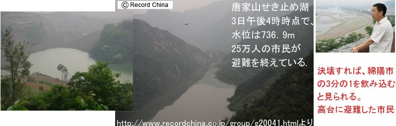 | 1424 2008-06-07 (Sat) 唐家山せき止め湖決壊危機から学ぶ 綿陽市の上流にある唐家山せき止め湖が決壊する可能性があるという報道があります。 http://www.recordchina.co.jp/group/g20041.html ーーーーーーーーーーーーーーーーーーーーーーーーー