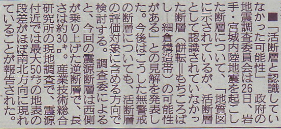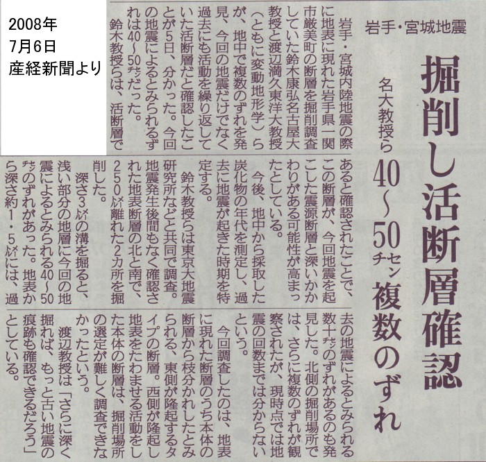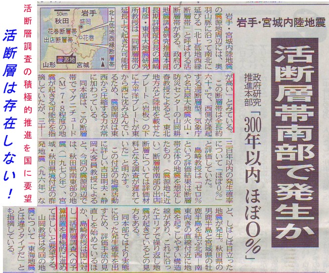 | 1439 2008-06-24(Tue) ストップ・ザ活断層調査 地震発生以来、新聞報道の切抜きを保存しておきました。読み返すと、16日の中日新聞夕刊に「活断層調査の積極的推進を国にお願いする」という島崎教授のコメントがありました。 何度も書いてきましたが、地震爆発論の立場で見れば、活断層という概念は成立しません。断層は大爆発による傷痕に過ぎませんから、どれだけ精細に断層調査を行ったところで、地震予知には何の効果も齎しません。活断層にこだわる姿勢を改めて欲しいと思いますし、そのような調査に莫大な予算措置をとることを止めていただきたいと思います。 ![]() ;6月17日中日新聞夕刊より 記事を見ると、島崎教授は地震調査研究推進本部長期評価部会長だそうですが、地震のあった日に開催された臨時の地震調査委員会に出席され、個人的感想を次のように述べておられます。会議では、断層が西傾斜か東傾斜かという基本的なことさえも、断定できなかったそうであります。活断層とは地表に現れたり、地下に隠れたり、しかし地下では繋がっていると解釈されています。活断層の存在を確定することが如何に難しい作業であるかが分かりますので紹介しておきます。 ーーーーーーーーーーーーーーーーーーーーーーーーーーーーーーーーー 地震調査委員会による評価など