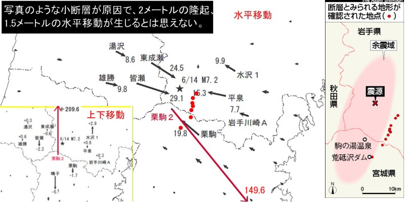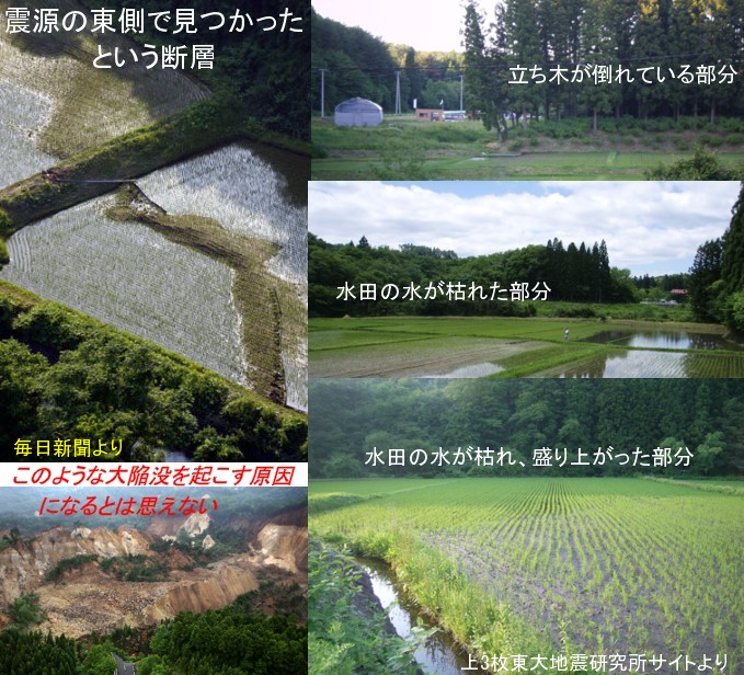 | 1433 2008-06-19 (Thu) こんな小さな断層が巨大地震を起こすのではない 産業技術総合研究所の調査で今回の地震で断層が15キロに渡り露出していたのが見つかったという毎日新聞の報道があります。 ーーーーーーーーーーーーーーーーーーーーーーーーーーーーーーーーーーーーーーー http://headlines.yahoo.co.jp/hl?a=20080619-00000016-maiall-soci <岩手・宮城地震>15キロにわたり断層露出 水田にくっきり 6月19日14時13分配信 毎日新聞 水田にくっきりと現れた断層=岩手県奥州市衣川区餅転で18日午後4時50分、本社ヘリから森田剛史撮影(下記写真の左上) 岩手・宮城内陸地震の震源に近い5地域で断層が地表に現れていることを、産業技術総合研究所(茨城県つくば市)が19日までの調査で確認した。北東から南西方向に断続的に約15キロにわたって露出し、地表に40〜50センチの段差を作っていた。 北端にあたる岩手県奥州市衣川区餅転(もちころばし)地域では、2枚の水田で断層が地表に現れ、断層をはさんで西側部分がジグザグに約45センチ盛り上がっていた。 5地点のうち4地点は、岩手・宮城県境にある約10キロの古い断層に沿うように露出していた。産総研の吉見雅行研究員は「この断層が地震を起こした可能性もあるが、この規模の大地震では2メートルくらいの段差が地表に現れてもおかしくない。別の断層が地震を起こし、その影響でこの断層が地表に現れた可能性もある」と話している。【斎藤広子】 ーーーーーーーーーーーーーーーーーーーーーーーーーーーーーーーーーーーーーーー 掲載写真にある段差は小さなものですから、もっと大きな別の断層が地震を起こした可能性もあると吉見研究員が述べています。 また、東京大学地震研究所の調査報告では本震の東側数箇所に断層が現れていて、周辺に崩落現象が起こっていないことから、テクトニックな要因で起きた地震断層である可能性があると述べています。 http://www.eri.u-tokyo.ac.jp/topics/Iwate2008/fault_by_THK/ ![]() 確かに周辺に崩落現象があれば、地すべりによる断差の可能性が高いですから、テクトニクス要因の地震断層を調査する場合は崩壊現象がない場所で探すということになるのでしょう。 しかし、このような小さな断層が動くことが原因となって最下段に示すような大陥没が起こるとは想像もできません。 「プレートテクトニクス理論によれば、圧縮軸方向の圧力によって岩盤の食い違いが起こるはずだ、これが地震に違いない。既存の断層がなくてもそれによって新しく断層ができるはずだ。」 という固定観念から、小さな断層に地震の原因を背負わせている「断層冤罪?」としか考えられません。 ![]() 再度上下移動と、水平移動の量的分布を載せますが、震源付近と(誤差があるかもしれないという)水沢付近を除けば大きな上下動は全体的に沈降を示しています。西側の地盤が東側の地盤に乗り上げる形の逆断層が起きたのならば、西側地盤は隆起しなければいけないはずですが、地震研究所の報告では東上がりとなっていて、矛盾があります。震源地殻の栗駒2だけが異常に大きな変移量を示すのも、地震爆発論でなければ説明がつかないと思います。 写真の段差はすべて押し領域と引き領域の境界に現れた地盤の傷痕に過ぎません。爆発の影響で自由端部の振動が激しく、耐え切れなくなって破れた地球の表皮でもあります。押し引きの境界ではなくても、振動の激しかった部分では大きな傷ができてしまいます。それが大陥没であり、山間部の崩落現象です。 毎日新聞の写真は西上がりの段差ですが、ほかの写真は東上がりの段差ですから、報道されているような逆断層解釈とは矛盾します。これらが本震を起こした主原因の断層とは思われません。自由端部という破れやすい場所に発生した傷痕に過ぎないと考えます。 |