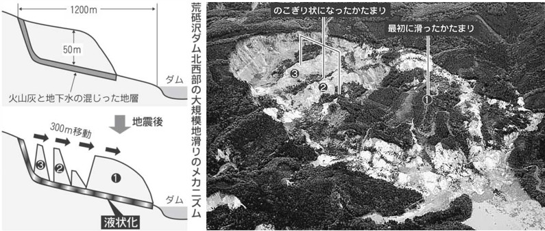 | 1437 2008-06-22(Sun) 荒砥沢ダム上流の崩壊は液状化による地滑りという説 荒砥沢ダム上流部の大崩落に関して、地震爆発説の立場からは「ガスの噴出による粉体流」が原因である、という考え方をとっています。しかし、地滑りの専門家は滑り面に相当する部分に地震動による液状化現象が発生し、その上部に載っている山体を地滑りさせた、と考えておられるようです。毎日新聞が報じる内容を抜粋して紹介します。 ーーーーーーーーーーーーーーーーーーーーーーーーーーーーーー http://mainichi.jp/select/science/news/20080622ddm016040057000c.html 岩手・宮城内陸地震:地滑りのメカニズム 山を崩した、火山灰と地下水 14日に起きた岩手・宮城内陸地震=マグニチュード(M)7・2=では、山間部で過去最大級の地滑りが発生し、東京ドーム60個分近くもの土砂が流れ出た。また、震源に近い岩手県一関市では国内最大の4000ガルを超える大きな揺れを観測した。記録ずくめとなった今回の地震だが、こうした現象はなぜ起きたのか。そのメカニズムに迫った。【斎藤広子、関東晋慈、河内敏康】 ![]() http://mainichi.jp/select/jiken/graph/20080614/4.html http://mainichi.jp/select/jiken/graph/20080614/3.html より ◆のこぎり状の山脈 「地滑りが起きている場所とそうでない場所が、思っていた以上にはっきりしていた」。現場上空からヘリコプターで視察した防災科学技術研究所の井口隆総括主任研究員(応用地質学)は驚きを隠せない。 岩手・宮城内陸地震では、大規模な地滑りが発生したことが大きな特徴だ。特に顕著だったのは、宮城県栗原市の荒砥沢ダムの周辺。ダム北西部では長さ1・2キロ、幅800メートル、厚さ50メートルにわたって山肌がえぐられた。この部分は横から見ると、地滑りで移動した土砂のかたまりが、のこぎり状の山脈のような姿になっている。国土地理院が公開した航空写真から、道路などが水平方向に300メートル動いたと確認された。 ◆半世紀で最大規模 20日に東京で開かれた土木学会など関連4学会による緊急現地調査報告会では、流れ出た土砂は東京ドーム60個分近くの約7000万立方メートルとされた。半世紀の間でも最大規模だ。地滑りは、この山の反対側や、隣の山など4、5カ所に集中した。だが、<b>わずか数百メートル離れた場所ではまったく起きていなかった。</b> (略) ◆液状化で摩擦減少 大規模な地滑りはなぜ起こったのか。国際斜面災害研究機構会長の佐々恭二京都大名誉教授(地滑り学)は、地下水と火山灰の影響を指摘する。 気象庁によると、荒砥沢ダムのある地域は、1744年に栗駒山が噴火を起こすなど周辺の山々の噴火によって大量の火山灰が降り積もっている。火山灰に地下水の混じった地層は、地震で揺すられると一部が液状化する。摩擦が少なくなり、この上に乗っている表層の地盤が滑りやすくなる。 佐々名誉教授は「人の重さによって氷が解けて滑るアイススケートと同じ原理。上に重いものが乗っていても、摩擦が少なければ滑る」と話す。こうした現象は、10〜20度程度のゆるやかな勾配(こうばい)でも起きるという。 ◆なだらか地形に注意 同じ現象は過去にも起きている。例えば、84年の長野県西部地震では、東京ドーム約30個分に相当する約3600万立方メートルもの土砂が流れ出た「御岳大崩壊」が発生した。04年の新潟県中越地震でも地滑りが起きている。 (略) ◇地層の境界で揺れが増幅−−国内最大4000ガルの理由 ◆シャトル打ち上げ超す 岩手・宮城内陸地震のもう一つの大きな特徴は、国内最大の4022ガルの加速度を観測したことだ。これまで最大だった04年10月の新潟県中越地震(2515ガル)を大きく上回った。観測点が地震を起こした断層に近かったことに加え、地盤表面の地層の境界で地震波が大幅に増幅したためとみられる。 加速度は揺れの強さを表す指標。建物などに加わる瞬間的な力の強さに対応する。例えば、揺れが約980ガルを超えると、固定されていない物体は浮き上がる。スペースシャトルの打ち上げ時や、ジェットコースター降下時での最大加速度が約3000ガルという。 国内最大の加速度を観測したのは、岩手県一関市に設置された地震計。震源からの距離はわずか約3キロだった。 ◆逆断層の縦ずれ なぜ大きな加速度が生じたのか。東京大地震研究所の纐纈一起(こうけつかずき)教授(強震動地震学)は「典型的な逆断層型の地震で、縦ずれを起こしたことが要因」と説明する。 地震波は周期の異なる複数の波が合成されてできたもので、加速度の大きさは一般に短い周期の波の強さに左右される。典型的な逆断層型の地震では、この短周期の波を強く出す特性がある。震源からの距離が近かったことも大きく影響したという。 中国で5月に起きた四川大地震(M8)では、最大加速度は約550ガルしか観測されなかった。同じ逆断層型でも、横ずれ成分が多く含まれていたためとみられる。纐纈教授は「(岩手・宮城内陸地震は)逆断層型では世界最大級の揺れの強さではないか」と推測する。 ◆地震波が屈折した 