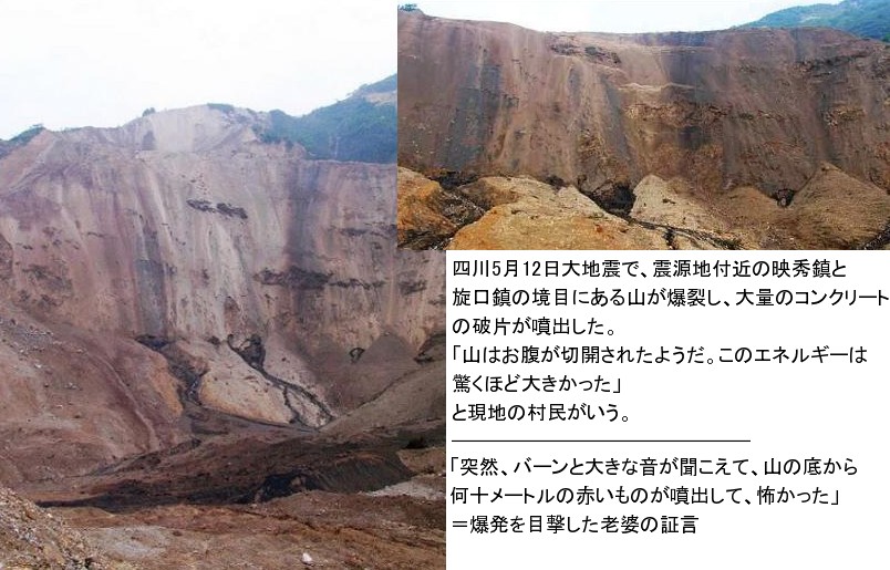 | 1450 地震によって起きる大崩落の原因 2008-07-07(Mon) 大紀元日本によると、四川大地震で、中国最大の兵器庫が破壊されたそうです。抜粋して紹介します。 ――――――――――――――――――――――――――――――――――――――― http://jp.epochtimes.com/jp/2008/07/html/d64414.html 四川大地震、中共軍最大の兵器庫を破壊 ![]() 大紀元日本より ・ 地震が、山の下に隠されている武器弾薬庫の連鎖爆発を引き起こし、何十年もの間使用されてきた中共軍の最大規模の兵器補給庫を完全破壊した。 ・ 震源地では地震の以外、非地質的な原因で発生した振動も確認されたという。それにより発生したエネルギーは、地下核爆発に相当するという。 ・ 地震が発生した時、震源地付近の山が爆発され、山頂から大量のコンクリートの破片が出たことも報道された。 ・ 中国官製報道機関中国新聞社5月31日の報道によると、5月12日地震発生当時、震源地付近の映秀鎮と旋口鎮の境目にある山、突然地面と山が激しく揺れ始め、同時に凄まじい爆発音に伴い、付近の山頂に穴が開き、そこから歯磨き粉を絞り出すかのようにコンクリートの破片が三分間も噴出し続けた。 ――――――――――――――――――――――――――――――――――――――― 以上が抜粋記事ですが、核爆発が起こったのではないかという心配が[1423]での記事にも報じられていました。「非地質的な原因で発生した振動」というのが、核爆発を想定させているのでしょうが、本当に核爆発であれば大変な核物質汚染が広がっているわけですから、情報を見る限りその心配はないと思います。何らかの兵器の爆発が起こった可能性はあるでしょうが、[1423]にも書きましたように、「これを書いた本人は地震爆発説をご存知ないから核爆発まで想定したのでしょうが、そこまで考える必要はないと思います。」・・・・というのが感想です。 しかしそれほど、地震の爆発力が凄まじいことを大紀元報道の写真は表しています。 岩手宮城内陸地震で発生した、荒砥沢ダム上流の破壊もそうですが、このような大崩落を起こす原因が名大教授らによって発見されたという小さな「活断層」によって引き起こされることはありません。
