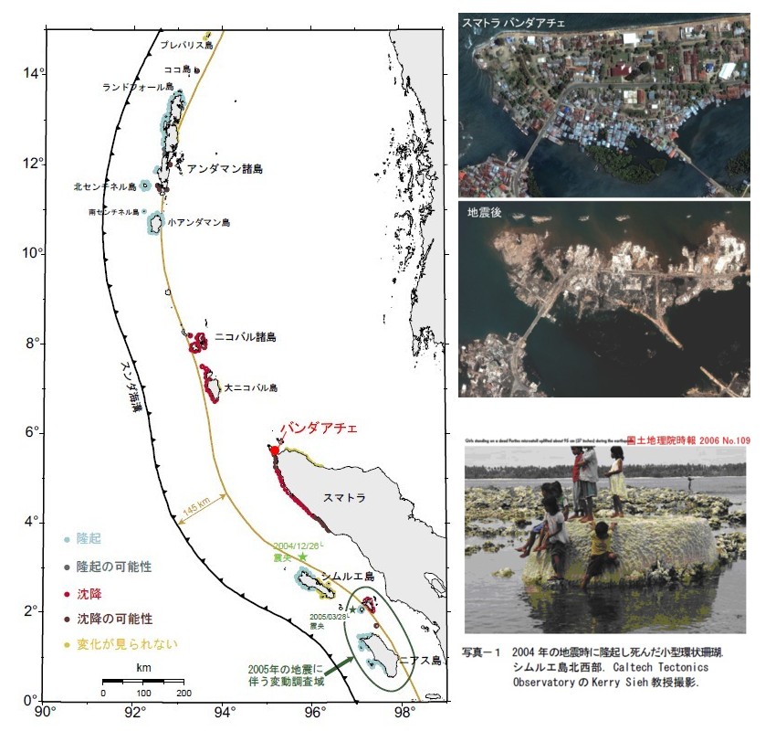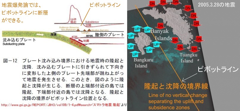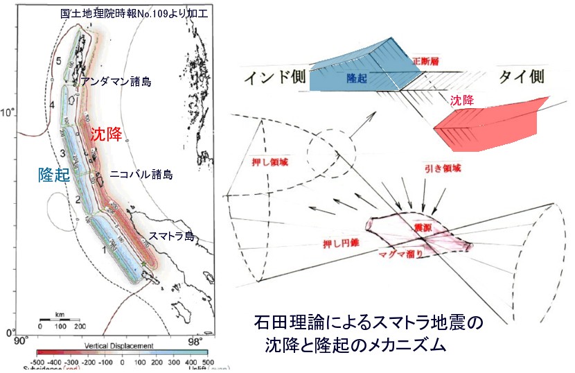 | 1449 スマトラ沖地震の沈降と隆起のメカニズム 2008-07-05 (Sat) [1447]の追記に次のようなテレビ報道の件を紹介しました。 「丁度そんな時、スマトラ沖地震の起きた瞬間を上空からの記録フィルムがテレビにながれ、目を擦りました。丁度数珠球の様に点と思える波紋が次々と、時間差を持ちながら、生まれ、繋がり、やがて線となった波紋が、津波として東西に広がって行く光景に釘ずけになりました。驚きました。」 当時私も、テレビを見た記憶がありますが、記録フィルムだったのか、シミュレーションの結果だったのかは明確な記憶がありません。どなたか、ご記憶であれば、また動画が残っているものなら所在を教えてください。 何点かの震源から爆発の波紋のようなものが、数珠球の様に繋がって広がっていく様子が動画になっていましたが、国土地理院の次のような解析(2004.12.26の地震について解析したもの)を別の表現で報道したものだったのかもしれません。 http://www.gsi.go.jp/BOUSAI/sumatora/animation/sm+as+fltfinal.html 国土地理院の解析では東側が沈降し、西側が隆起する絵がスマトラ沖からアンダマン海まで北上して描かれています。なぜ東が沈降し西が隆起するのかは、当時の新聞にも報道されましたが、プレートの潜り込みによって起こると解釈されています。ニューオフィス46には毎日新聞と読売新聞の記事から取った図面を紹介しています。新聞記者の独善的解釈かともおもいましたが、国土地理院地理地殻活動研究センタートピックスにはもっと詳しく、解説付き図面が載っていました。 ![]() 石田理論によるスマトラ地震の沈降と隆起のメカニズム ![]() 国土地理院時報2006No109より 解説には「沈み込むプレートに引きずられて下向きに変形した上側のプレート先端部が跳ね上がって地震を発生させる。このとき、図のように隆起と沈降が生じる。」とありますが、ニューオフィスに書いたような「剛体であるプレートがなぜ「こんにゃく板」のように変形するのか?」という疑問は残ったままです。 石田理論では、ニューオフィス46;にも解説したように、押し円錐の軸が西から東にむかって沈むような傾斜軸になっていて、東側のバンダアチェなどは引き領域で沈降し、アンダマン諸島やシムエル島、ニアス島などは押し領域で隆起したのだと解釈しています。