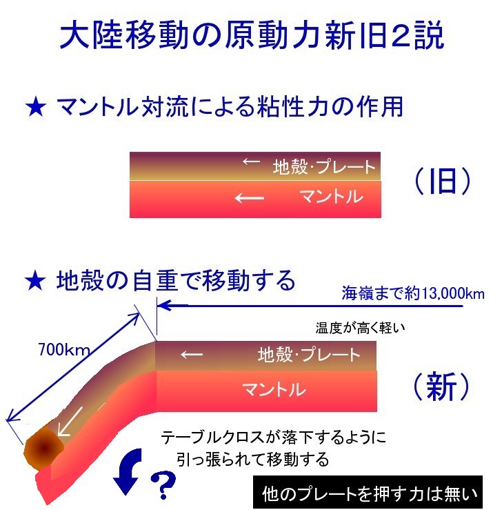 | 1458 2008-07-22(Thu) 大陸移動の原動力に関する矛盾 次に大陸移動の原動力についての新旧2説の解説文を紹介します。 ![]() ウェゲナーの大陸移動説がいったん否定される原因となったのは大陸移動の原動力に関して説明できなかったからです。当時は岩流圏のマントルが流動する時に、その上の地殻を含むプレートが粘性摩擦によって引きずられるからであるという考え方がなされていたのですが、計算するとそれには無理があることが判明しています。 現在ではマントルの移動とは関係なくプレート自身の自重によって、沈降していくという能動的移動論という解釈が採られています。 つまり、海嶺で誕生したプレートは移動して海溝まで到達する間に冷却され、密度が高くなって、自重によって沈降していくという考えかたです。テーブルクロスがずり落ちるように水平部分のプレートを引っ張って流動して行くという解釈です。 ということは日本海溝では、太平洋プレートが自重で沈降しているのであって、ユーラシアプレートに乗っている日本列島に圧力を掛けて、それによって日本列島に巨大地震を発生させるというようなメカニズムは考え難いのではないかという解釈も出てくることになります。 それにしても、日本海溝から太平洋の海嶺までは地球円周の三分の一くらいの距離すなわち、約13,000kmもあります。その大きなテーブルクロスを6%にも満たない高々700kmの長さの沈み込みプレートの自重によって引きずり下ろすことなどできるわけが無い・・・というのが冷静な見方ではないでしょうか。 そのようなプレート論で地震の発生は説明できないということも冷静に考えれば分かることであります。 以上が解説文であります。通説のプレート論では陸側プレートに圧力を掛けて、山脈を構成させたり、潜り込んで地震を発生させたりするような能力は期待できません。ただ自重で沈んでいくというのですから・・・。 太平洋の真ん中で沈んでもおかしくないわけですが、なぜ海溝までたどり着くのか納得できる説明はありません。 |