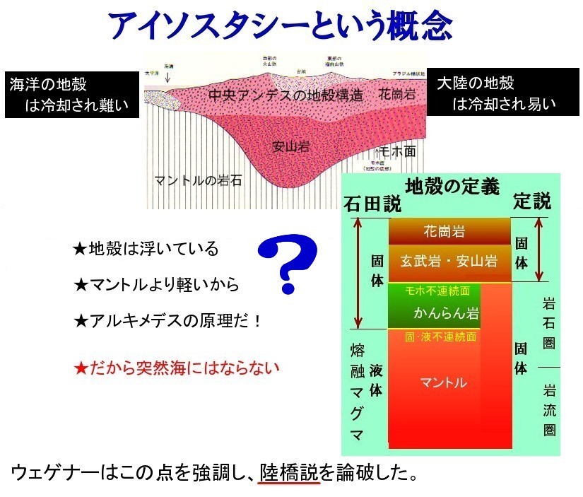 | 1457 2008-07-22(Thu) アイソスタシーという矛盾概念 解説用DVDのナレーションの中から「アイソスタシーの概念」を紹介します。マントル熔融説に関連する地球科学上の重大問題の提言でもあります。 ![]() アイソスタシーという概念は地球科学の中では大変重要な意味を持っています。この概念があるために、アトランティスやムーなどの大陸が沈没したというのは「あり得ない話」という結論になっているのです。 アイソスタシーの概念を説明する前に、地殻の定義をしておく必用があります。 通説では大陸というものは最上部に花崗岩が存在し、その下に安山岩や玄武岩があるとされています。海洋底拡大説から導かれる結論でもありますが、海底には花崗岩は存在しないと言われています。さらにその下にはカンラン岩と云う硬くて緻密な岩石があり、地震波の伝播速度が大きく違うことが知られています。この境界面を発見者の名前をつけてモホロビッチ不連続面、略してモホ面と呼んでいます。 通説ではこのモホ面より下をマントルと呼んでいます。マントル内部には温度の高い部分があって、そこを境に上部マントル、下部マントルと呼びます。モホ面までと、上部マントルを含んだ部分を岩石圏、その下を岩流圏と呼ぶこともあります。岩流圏といっても、固体であり、せん断波であるS波も通過するとしています。つまりマントルは固体であるという立場を取っています。 一方石田仮説では、地球誕生以来の歴史から類推して少し解釈を変えています。地球は誕生してからしばらくは、マグマオーシャンという状態で陸地は存在していませんでした。 冷却が進行し、薄皮のように固形化した陸地が誕生し、海が形成され、やっと動植物や人間が生活できる環境ができたというのが間違いのない歴史であります。冷却は現在も進行していて、陸地の下はマグマオーシャンの状態であると推定できます。したがって、固形化した部分を地殻と呼び、その下には熔融状態のマグマが存在していると考えるのはごくノーマルな判断であります。 そこで、石田仮説では、モホ面の下にある固体部分までを地殻とよび、その下のマントルは熔融マグマであると解釈します。なお、この考え方は勝手な憶測で決めているのではなく、後で説明する地震波の伝播経路の検討からも誘導される根拠のある推定であります。 ではここで、アイソスタシーの概念を説明します。これは「地殻はマントルよりも軽いので氷山が海に浮いているように、浮かんでいるのである。」という概念です。 通説での地殻、つまりモホ面までの厚さは大陸では厚く、海洋部分では薄いのでそのように見えるのですが、アルキメデスの原理により大きな浮力を得るために、大陸は厚くなっている、という解釈です。 ウェゲナーはこの解釈に基づいて大陸の一部が急に厚さの薄い海洋底に変化することはあり得ない、として陸橋説を論破しました。 しかし、固体であるマントルが、固体である地殻を浮力によって浮かべている・・・という説明はレオロジーという概念を使用しても、正当性が疑問視されます。レオロジーとは、固体であっても、長い時間を掛ければ氷河が移動するように変形・移動することができるという考え方です。 石田仮説では、大陸は冷却されやすく、分厚くなりますが、海洋では冷却され難くて、地殻が薄いのだと解釈します。 以上が解説文です。物質は固体であっても、長時間掛ければ変形し、移動するというレオロジーという概念は地震波の伝播問題を扱うスタート点で、マントル中を伝播すると仮定したことの矛盾を繕うために採用された「こじ付け的概念」だと思っています。実験室ではレオロジーが証明されているという認識なのでしょうが、岩石は水を含めば融点が極端に下がるということが分かっていますから、無水状態での実験結果を信じてレオロジーに固執するべきではありません。 |
