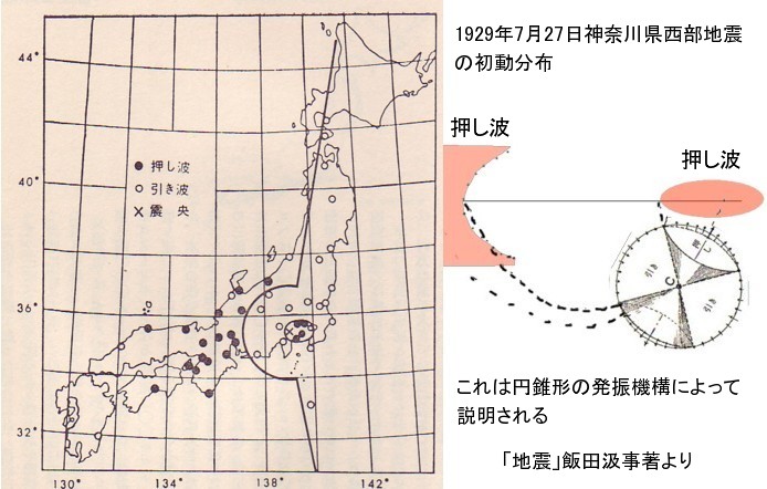 | 1469 2008-07-30(Wed) 飯田汲事先生の著書より それほど古い本ではありませんが、昭和47年発行の飯田汲事先生の「地震」という書籍には四象限型の押し引き分布では説明できない分布があり、押し円錐が有効であるという記述があります。四象限型の分布は震源が浅く、押し円錐の軸が水平の場合の特殊な事例であるという解釈(笠原慶一先生の解説がニューオフィス48にあります)のほうが地震現象を明確に捉えていると思います。飯田先生の書籍から紹介します。 晩年の飯田先生とお話したときに先生はプレート論を板論と称しておられ、「板論は怪しいね」と懐疑的な発言をされていたのを覚えています。 ーーーーーーーーーーーーーーーーーーーーーーーーーーーーーーーーー いろいろの地震の初動分布を調べてみると、地震によってはそれが四象限型にはならないものがある。この場合、初動の押しと引きの二種類を境する曲線が円錐曲線で表わされるのである。下に一例を示した。 ![]() 震源がモホ面より下にある場合には屈折作用によって節線が複雑になります。 二種の波動を境する曲線すなわち節線は楕円であったり、双曲線や放物線になったりしている。これは円錐に交わる平面の角度によっていろいろな形ができるからである。(管理人補足:[1467]に示すようなもの)円錐形が生ずるには、震源の相接した二点が両側に急に運動する場合にできる。したがって震源で爆発現象として一方の壁を破って物体が突出するような現象が行なわれれば、これが実現できる。これは地殻内にマグマ溜があってそれが急激な運動を起こして、周囲の弱い岩石を破壊して貫入することによって地震が起きるという、マグマ貫入説として説明されるわけである。 ーーーーーーーーーーーーーーーーーーーーーーーーーーーーーーーーー 以上が飯田先生の記事からの紹介です。 昭和36年にアメリカ帰りの安芸先生が転向宣言されて断層地震説を支持された後でも、飯田先生はマグマ貫入理論を捨ててはおられませんでした。そのご、全ての分布が四象限型で表示できることがわかったということのようですが、表示は可能になったとしても、物理的なイメージは大変希薄になってしまったように思います。 |
