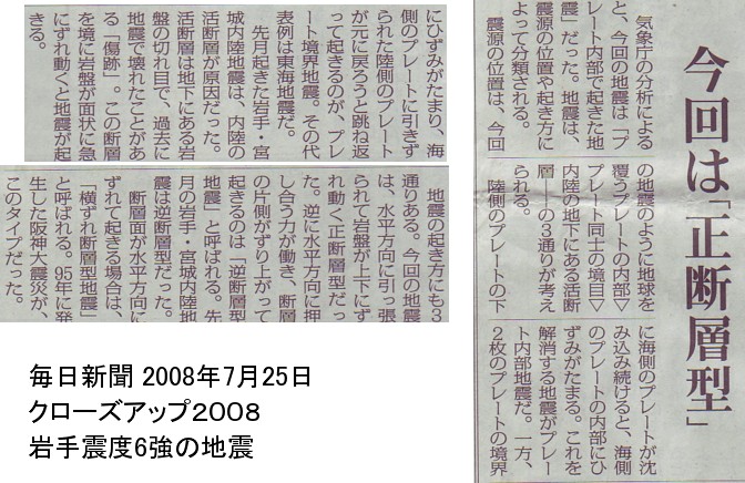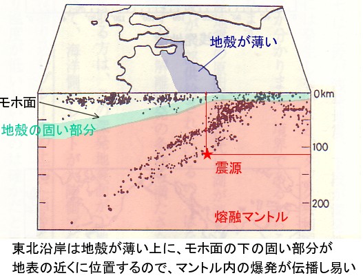 | 1462 2008-07-24(Thu) また東北で大きな地震 また、東北地方で大きな地震がありました。東北地方の被害者にはお気の毒なことですが、この地震から地震の真相を学ぶべきだと思います。報道を紹介しておきます。 ![]() 太平洋プレート内部で発生=二重面の下層、小地震は頻発 7月24日2時45分配信 時事通信 岩手県で震度6強を観測した地震は、陸側のプレート(岩盤)の下に沈み込む太平洋プレートの内部で起きた「スラブ内地震」とみられている。平田直東大地震研究所教授は「震源が相当深い。岩手・宮城内陸地震のような内陸型ではなく、太平洋プレートの沈み込みに関係する地震」と述べた。 震源地付近は、太平洋プレートが東から西に向かって深く潜り込んでいる。気象庁によると、地震のメカニズムは東西方向に引っ張られた正断層型で、沈み込む太平洋プレート内の深い所ではこのタイプの地震が起きることが知られている。 同教授は「この規模の地震がどの程度の頻度であるのか分からないが、起きても不思議はない場所」と指摘。東北地方で規模の大きな地震が続いたが、タイプが異なり、関連性はないという。 岩手で震度6強 太平洋プレート内部で発生か 02:42更新 http://www.iza.ne.jp/news/newsarticle/event/disaster/163696/ 東北地方の太平洋側では、東から西に移動している太平洋プレート(岩板)が陸のプレート(北米プレート)の下に沈み込んでいる。今回の地震は、太平洋プレートの内部で起きた地震とみられ、2つのプレートの境界で発生する海溝型地震とはメカニズムが異なる。 東北大学の海野徳仁教授によると、太平洋プレートの内部で起こる地震は、上下の2層構造になっており、今回は下面で発生したため、震源が120キロという深さだった。上面と下面では地震のメカニズムも異なり、上面側では断層面に圧縮力が働く「逆断層型」、下面では断層面が引き離されように力が働く「正断層型」の地震が起こることが知られ、今回の地震は正断層型だという。 東北地方で近年に起きた太平洋プレート内部の地震としては、平成15年5月に宮城県・気仙沼沖の深さ70キロで発生したマグニチュード(M)7・1の地震がある。この地震は、太平洋プレートの上面側で起きた逆断層型だった。 今回の地震は、岩手、青森県を中心に広い範囲で強い揺れが観測された。これは、震源が深いために地表での距離が離れていても震源からの距離の差が小さいためで、震源の深い地震の特徴の一つだ。 海野教授によると、太平洋プレートの下面側ではマグニチュード(M)6級までの地震は観測されるが、M7に近い規模は極めてまれだという。また、一般に震源が深いほど、余震の回数は少ないとされる。 東北地方で火災、落石、倒木…1か月で2回目の震度6.7 7月24日2時32分配信 読売新聞 東北地方をまた激しい揺れが襲った。岩手県の太平洋側北部で震度6強を記録した24日未明の地震。震度5弱以上の地震は今年に入って7回目で、東北地方ではわずか約1か月の間に2回目の震度6となった。頻発する地震に、寝静まった町は不安に包まれた。 「いきなりドーンという突き上げがあって、大きな横揺れが来た」 震度6強を観測した岩手県洋野町。就寝中だった主婦、菖蒲沢ユリ子さん(61)は「先月の揺れよりずっと大きかった。戸棚の中のコップや食器が割れていた」と声を震わせた。 1. 町役場2階で仕事をしていた企画課の佐々木貴光さんは「最初『ドーン』と大きな縦揺れがあり、それから横揺れが続いた。揺れは大きく、カウンターにあった花瓶が落ちて割れ、給湯室の食器類も割れてめちゃくちゃになった。窓ガラスにもひびが入ったようだ」と地震直後の様子を語った。(後略) ★★★★★★★★★★★★★★★★★★★★★★★★ いずれも、太平洋プレートとの関連で、「地震のメカニズムは東西方向に引っ張られた正断層型」という解説になっています。なぜプレートの上面では押されて逆断層になり、プレートの下面では引っ張られて正断層になるのか理屈が理解できません。 「いきなりドーンという突き上げがあって、大きな横揺れが来た」という体験談からは、地震が爆発であることを物語っています。断層地震説に拘る人はいつまでたっても、プレートとの関連を捨てようとしませんから、新しい地震観・・・といってもフンボルトの地震観に戻すだけなのですが・・・を早く広めないといけません。 それでは、「岩手、青森県を中心に広い範囲で強い揺れが観測された。これは、震源が深いために地表での距離が離れていても震源からの距離の差が小さいためで、震源の深い地震の特徴の一つだ。」と言う通説の解説とは違う地震爆発説での解説をしておきます。 ![]() 深発地震ではウラジオストックあたりの地震でも東北沿岸の震度が大きくなることがあります。これは大陸端部では地殻が海洋に向けて次第に薄くなっていくので、モホ面以下の固い部分も地表に近くに位置することが原因です。マントル内部での爆発の震動が、この緻密な部分