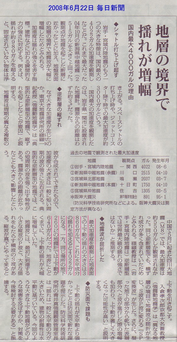 | 1461 2008-07-24(Thu) 4000ガルの発生理由 6月22日の毎日新聞に岩手宮城内陸地震で4000ガルの加速度が生じた理由が解説してありました。地層の境界で揺れが増幅したとか、「SP変換波が生じた」ということですが、このような加速度は爆発現象でしか説明できないように思います。 ![]() 別の記事では「山中佳子・名古屋大准教授は、地震波を解析し、今回の地震の断層面が長さ約40km幅約15kmに及ぶことを突き止めた。この断層面が19秒かけて最大で約4メートル動き、地震が発生したと予想する。」ともありますが、19秒かけて4メートル動く物理現象から4000ガルの加速度は絶対に発生しません。 また、新聞記事には地表面では4022ガルだが、同じ場所の地下260mの地震計では上下動が640ガルという小さなものであったことが報告されています。爆発点である震源に近いにもかかわらず加速度が小さいということは動きが拘束されているということを意味しています。 これは、[1427]で述べたように地表面は自由端として自由に動けますが、地下内部は固定端として拘束されているために、動きが自由でないために加速度が小さくなることを意味しています。つまり地震が爆発現象であることを物語っているのであって、揺れが増幅したとか、変換波が生じたということではありません。ここにも、断層地震学の破綻が現れています。 |