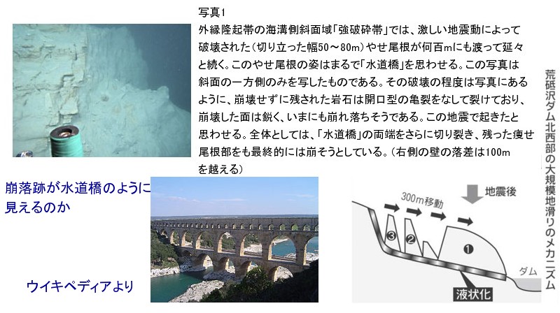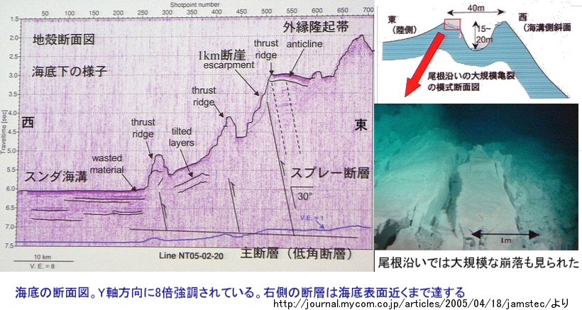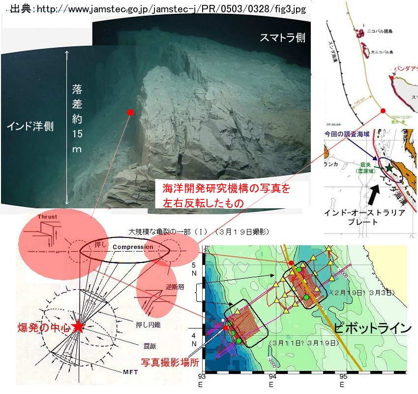 | 1453 2008-17-12(Sat) スマトラ沖地震再考 [1449]で述べた「スンダ海溝には断層は見つからないでしょう。」というコメントを撤回します。理由は現地調査の報告を見るとスンダ海溝のほうが大きな地変がありそうだからです。 スマトラ沖地震が発生した直後に海洋研究開発機構が行った調査結果に、興味深いものがありました。 http://www.jamstec.go.jp/jamstec-j/PR/0503/0328/index.html ![]() 海洋開発研究機構サイトより加工させていただきました。 スンダ海溝付近の斜面に段差が100メートル以上あるという海底崩壊現象が見られます。 ![]() 洋開発研究機構サイトより このように、スンダ海溝に大きな地震の傷痕が残っていますので、爆発の角度(押し円錐の傾斜角度)は[1449]および;ニューオフィス46で述べたような、西上がりになるのではなく、もっと垂直に近いものだと思われます。写真に見られる大きな崩落は衝上げ断層(Thrust)によるものか、または岩手・宮城内陸地震において荒砥沢ダム上流に発生したような崩落が起こって、やせ尾根のように残っているものなのかは不明です。 しかし、インド洋を襲ったあの大津波が、[1449]に紹介したピボットライン付近での地変だけで発生したとは考えにくいので、もっと沖合いのスンダ海溝に近い部分で衝上げ断層が発生したことが推定できます。ピボットライン付近の東西にできる沈降領域と隆起領域も押し円錐の引き領域と押し領域に該当しますが、より大きな断層が出来るのは、沖合いのThrustではなかったかと思われます。こうした爆発が北方に連鎖的に連続して起きたことが大きな被害を引き起こした地震のメカニズムであると考えられます。 また、同じ海洋研究開発機構の調査結果速報の図面からも、海洋底の上面部分にまで達するようなThrustが形成された様子が伺えます。今回の地震ではこのような大規模な爆発がアンダマン海域までの5箇所で同時に起きたことがうかがえます。 ![]() 海洋研究開発機構・調査結果速報より |