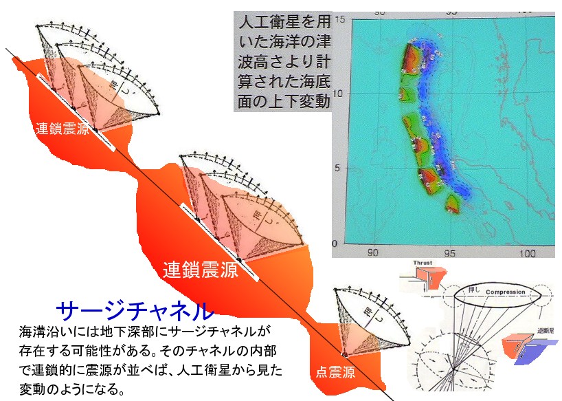| 1454 2008-07-12(Sat) 連鎖震源の考え方 海洋研究開発機構の調査結果速報には、人工衛星から見た津波の高さをもとに、海底地盤の変動を計算した図面が載っていました。 こうのような海底の変動は通常起こるような爆発が一箇所という点震源では説明できません。 これは深発地震の特徴としてニューオフィス48に紹介した連鎖震源の考え方で説明できます。 日本海溝や南海トラフでもその可能性がありますが、海溝に沿っては地殻の厚さが急変するために、熱の流れが激しい場所です。ここでは冷却過程にある熔融マントルのチャネルが連結したサージチャネルが存在している可能性があります。そのチャネルが球形に近いものならば単震源になりますが、ナマコ上の形態をしていれば、爆発点つまり震源が連鎖状に並ぶことが考えられます。そのような、地震の場合にはスマトラ沖地震のように、隆起する領域と沈降する領域が帯状に並ぶことになります。