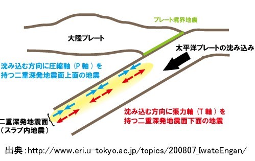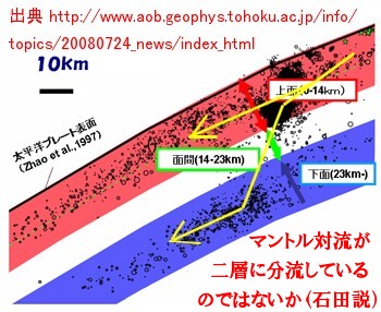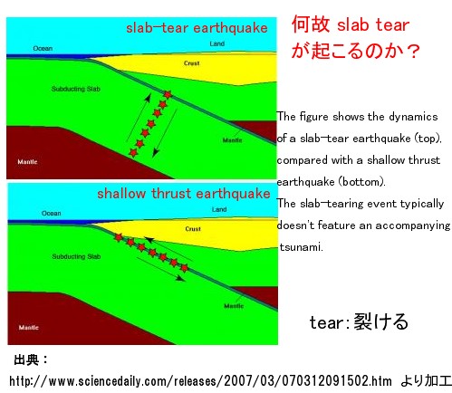 | 1570 2009-03-19 (Thu) 深発地震面の二重構造について [1566] で紹介したトンガ海域の巨大津波に関してNemo氏の解説では、 「プレート境界で発生する圧縮応力による逆断層型の地震ではなく、沈み込んでいる海洋プレート(スラブ)内で伸張応力によって発生した地震。そのため、上盤(陸側)プレートの跳ね上がりがなく、大きな津波が発生しなかった 。トンガ周辺で発生する地震では大きな津波がおきることは少ない」 と翻訳されています。 ![]() 元の記事を見ると、slab-tear earthquake という表現になっていますが、定説地震学では「伸張応力によって発生した地震」という解釈になるのでしょうか。Tearは裂けるという意味ですから、伸張応力によって裂けるという意味ならば、元記事にある図の解説とは結びつかない気がします。 一方、東京大学地震研究所のサイトには東北地方で起きる深発地震が二重構造になっていて、単純梁に発生する応力場と同じように、上面は圧縮力、下面は引張力が起きるとして以下のように解説してあります。 ーーーーーーーーーーーーーーーーーーーーーーーーーーーー 2008年7月24日 岩手県沿岸北部の地震の速報 2008年7月24日00:26、岩手県沿岸北部を震源とするMj6.8の地震が発生しました。 (後略) ________________________________________ 【概要】 USGSなどの自動決定による発震機構が、東西方向に伸張軸を持つ正断層型であること、震源の深さが108km(気象庁)と深いことから、太平洋プレートに見える二重深発地震面のうち深い方の面において、プレートの沈み込み方向に引っ張りの力(ダウンディップエクステンション: down-dip-extension)を受けて発生した地震と考えら れる。 東北地方の下に沈み込む太平洋プレートでは、地震分布が厚さ30km程度の薄い二つの層(プレートの上面近くの層と中心近くの層)に分かれ、これを二重深発地震面という。上面の地震は沈み込む方向に圧縮の力(ダウンディップコン プレッション: down-dip-compression)、下面では沈み込む方向に引っ張りの力により発生することが知られている。」 ![]() ーーーーーーーーーーーーーーーーーーーーーーーーーーーー 以上が東京大学地震研究所の解説です。単純梁の力学から類推して、上面で起きる地震は圧縮力が原因で、下面で起きる地震は引っ張り力が原因で、それぞれ地震になるのだと解釈しているとすれば、自重で沈降しているだけのプレートに何故そのような力が作用するのか理解ができません。単純梁に働く力学を固体で囲まれたプレートに適用するには無理があると思います。東京大学の解説では下面ではなく中間面となっていますが、どちらにしても「引き裂かれる」ことが原因で地震が起きるという力学的メカニズムは存在しないと思います。 また、トンガ周辺の深発地震面と東北地方のそれとが同じ構造なのか、それとも違うのかなどを含めて、定説地震学における深発地震面には理解し難いものがあります。 深発地震の二重面というものが重大な意味を持つものであるかのような雰囲気で研究が進められていて、脱水不安定説という考え方にまで発展しているようです。 しかし、二重面は世界の全地域で見られる普遍的な構造ではありません。東北地域に見られるだけのものです。(参考:ニューオフィス64「世界各地の深発地震面の形状」) 私はマントルの対流がこの部分だけ分流しているのではないかと思っています。つまり、東北地方の深発面が二重構造を持つのは、70km付近からマントルの流れが上層と下層の二つに分流し、140km付近でまた合流している姿を表しているのではないかと推定しています。 ![]() 誰も地球内部を実際に見ることはできませんから、諸現象を合理的に説明できるような説を採用するしかありません。 ![]() 深発地震面はマリアナ海溝周辺でも他の海溝でも複雑な構造をしていますが、マントルの対流が複雑な流れになっていて、その内部で水の解離と結合という化学反応が起こって、地震が起きていると考えています。これが「地震爆発論」での解釈です。 参考: ニューオフィス64、65セミナー[1524]〜[1528]など。 なお、地震爆発説では、深発地震が海溝でのみ発生し、海嶺では浅発地震しか起きない理由が合理的に説明できますが、断層地震説では合理的な説明が出来ないのではないでしょうか。どなたか事務局(ansin@ailab7.com )まで投稿して、説明をしていただければと思います。 |
