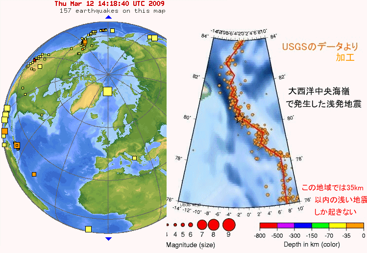 | 1567 2009-03-13 (Fri) 大西洋中央海嶺上での大きな地震 北極圏では珍しくM6.5という大きな地震が6日(金)にありました。震央は、北極圏にあるノルウェー領スヴァールバル島北西の大西洋中央海嶺付近です。この地震は、図に示すように大西洋中央海嶺の上で起きた浅い地震(深さ10km)であります。 ![]() Nemo氏のブログ「宏観亭見聞録」では「大西洋中央海嶺からのびるトランスフォーム断層(横ずれ断層の一種)でおきたものと思われます。」と紹介していますが、この地震はアイスランドで地上に現れ、さらに北上して伸びている中央海嶺の真上で起きているように見えます。 地震爆発論では海嶺上で起きる地震の原因は熔融マントルの対流が上昇するときに、マントルに含まれる解離水がその場の解離能力を超えるようになるために、爆発が起きて結合水に変換される化学反応である、という説明になります。(ニューオフィス26参照) ![]() ![]() 断層地震説では海嶺の真上でも断層反撥で説明するのでしょうか。また、海嶺はプレートが誕生して左右(東西)に拡がっていく場所という説明になっていますが、何故プレートの誕生する場所で摩擦による断層反撥が起きるのか理解に苦しみます。またこの付近は直ぐ西にグリーンランドがありますし、東にはスヴァールバル島があります。グリーンランドやスヴァールバル島は誕生したプレートとどのような関係になるのでしょうか。海底で誕生したけれども、年月が経つうちに陸上に姿を現したのでしょうか、それともグリーンランドの下に潜っているのでしょうか、プレート論者の説明を聞きたいのですが、疑問に答えてくれる方がありません。([1538]参照) |