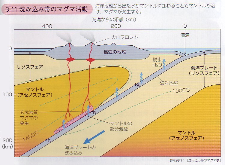 | 1557 2009-02-04 (Wed) 浅間山のマグマ活動から思うこと 噴火した浅間山をGPSで観測すると東京ドーム1.6杯分のマグマが上昇して山体を膨張させたことが判明した、と国土地理院が発表しました。毎日新聞が以下のように報道しています。 http://headlines.yahoo.co.jp/hl?a=20090203-00000129-mai-soci ――――――――――――――――――――――――――― <浅間山>地下マグマ量、東京ドーム1.6杯分 国土地理院 2月3日20時17分配信 毎日新聞 国土地理院(茨城県つくば市)は3日、噴火した浅間山(群馬・長野県境、標高2568メートル)の地下のマグマ量が、推定約200万立方メートルになると発表した。東京ドーム約1.6杯分に相当する。地上に出たマグマはごく一部で、地理院は引き続きマグマの動向を監視する。 GPS(全地球測位システム)の観測データをもとに、山体を膨張させたマグマの位置や深さ、体積変化などを計算した。 その結果、山頂火口の西北西約6キロ地点で、地下深くにあったマグマが、約7カ月かけてほぼ垂直に、岩盤の割れ目などを抜けて深さ約2キロの地中に達したという。また、マグマ量は約200万立方メートルで、中規模噴火とされた04年の200万〜300万立方メートルより小さいとしている。【石塚孝志】 ――――――――――――――――――――――――――― 国土地理院のサイトには次の図面が載っていました。 ![]() 説明では「(力源は)西北西約6キロ、地下2キロで、ほぼ垂直に板状にマグマが貫入したことが示唆される。」とあります。 @ マグマが貫入するエネルギーはどこから生じるのか。 A マグマが生成されるメカニズムはどのようなものか。 については特に説明がありません。 @の貫入エネルギーに関しては、マグマに含まれる解離ガスの爆発力であろうと考えていますが、定説では説明が出来ないように思います。 A のマグマ生成理論に関しては[1371]で、すでに説明しましたが、ここでは「地球のしくみ」と言う書籍(新星出版、2006年7月)の“マグマができる条件”および“沈み込み帯のマグマ”と題する節などから抜粋して紹介します。内容は明らかに定説の地震発生理論とは相容れないものだと思います。 「地球の仕組み」より抜粋 ーーーーーーーーーーーーーーーーーーーーーーーーーーーーーーーーーーー マグマができる条件 日本には狭い国土のいたる所に火山があるが、広大なオーストラリア大陸には火山はほとんど存在しない。これはなぜなのだろうか。地球上に最も大量に存在する玄武岩質マグマを例にとって、火山ができる条件を考えよう。 噴出したばかりのマグマの温度は1200で程度ある。マグマは地下深部で形成されるが、マグマが発生した場所の温度は、少なくとも噴出時の温度以上であったはずである。すると、地下の温度勾配から類推して、マグマが発生した場所は地下100km程度であったと考えられる。 その場所はマントルに相当し、かんらん岩からできていると推定されている。 ![]() 図3-3マントルがマグマになる条件(「地球のしくみ」(新星出版)より加工・加筆) 図3-3に地下の温度の深さ(=圧力)による変化をA線で示した。また、玄武岩質マグマの材料であるかんらん岩の圧力による融解温度の変化をB線で示した。 この図で注目すべきことは、どの深さでもA線はB線の下位にあり、2つの線は交差しないということである。このことは何を意味するか? それは、地球内部ではかんらん岩は溶けない、つまりマグマは発生しないということである。 (略) 世界の大部分の地域では火山が存在せず、つまり図3-3の通り、地下ではマグマがつくられていないことを示している。逆に地下でマグマが形成されている地域では、どんなしくみがはたらいているのか、それが次の疑問である。 マグマ発生とプレートテクトニクス 実際の地球内部で図3-3のA線上の点Pの状態にあるかんらん岩が溶けるには、かんらん岩の状態が変化してB線より上に位置することが必要だ。それには次の3つの可能性が考えられる。 @かんらん岩の温度上昇 (図3-3のP点からX方向の変化) Aかんらん岩の圧力低下 (図3-3のP点からY方向の変化) Aかんらん岩への水の添加 (図3-3のB線からB’線への変化) ところで、火山の分布(那須火山帯、富士火山帯など)は線上に連なっているが、これは、マグマの発生の原因がプレート境界と関係が深いことを示唆している。@〜BのうちABがプレート運動によるものである。 沈み込み帯のマグマ活動 日本列島の地下には、海溝から海洋ブレートが沈み込んでおり、火山や地震が日本列島に沿うように帯状に分布している(沈み込み帯という)。プレートの沈み込みが日本列島に火山が多い・・・つまり地下でマグマが発生する原因である。 マグマ発生の条件のひとつ「マントルヘの水の添加」については、図3-3でグラフをもとに説明した。実際には、マントルヘの水の注入口は「海溝」である。 海嶺で海水に接してつくられた海洋地殻の岩石には、含水鉱物として鉱物の結晶中に水が蓄えられている。海洋プレートが