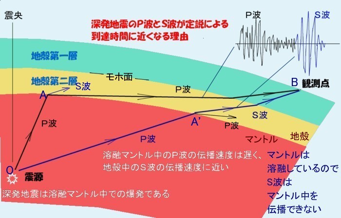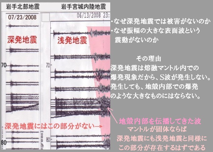 | 1553 2009-01-24 (Sat) 続・仮説の修正 深発地震の被害が小さい理由 [1464]の「仮説の修正」において、「地震波はマントル内部を通過していない」というこれまでの主張を修正しました。それは、[1356]で区分したAの波(遠地性浅発地震)の到達が理論に合わないように見えるのは、一箇所での波形記録を見ているからであって、何点かの記録を並べた表示で見れば理論に合うことが分かるという指摘があったからです。確かに東北地域で起きた浅発地震と深発地震の波形記録を並べてみると、少なくともP波はどちらも理論に合っていることが分かります。つまりマントル中を伝播していると判断せざるを得ません。 ![]() しかしそれにしても[1356」の@やAの浅発地震と、Bの深発地震とでは波形が違いすぎます。 ![]() そこでもう一度再検討して、[1325]の内容を書き直しておきました。同じ文脈ですがここでは、深発地震の被害は何故小さいのかという視点で説明します。震源が深いから被害が小さいのだ、というだけでは説得力がありません。 上に示した東北地方の地震に関しても言えることですが、[1325]に示した浅発地震と深発地震の波形記録でも同じですので、それを使って何故深発地震の被害が小さいのかを説明します。 ![]() 左側はフィジー諸島南の海域で起きた深発地震(深度507km)で、右側はマリアナ諸島の南海域で起こった浅発地震(深度10km)です。 深発地震では直達するP波とS波が明瞭に記録されていて、後続して大きな振動が続かない全体的に一定振幅の平易な波形であります。実は大きな振幅の後続波がないから相対的に明瞭に見えるわけです。 後続する震動がないのは深発地震が溶融マントルの内部で起きる地震であって、震源ではP波しか発生しないこと、つまりマントルが融解しているために震源でS波が発生しないことが原因だと思います。それで深発地震は被害が出ないのであろうと推定できます。 深発地震の記録でS波として現れているのはP波が地殻に衝突する際にP波の衝撃から誕生するものであろうということを述べてきました。しかし、そうではなくて(修正した考え方で)、粘弾性体であるからマントル中でもS波が発生するのであると想定しても、地震波のエネルギー(振幅)としては固体である地殻内部の爆発に比べて数パーセント程度であろうと推察されます。それが、地震被害を生まない理由でしょう。 一方右側の浅発地震(深度10km)は深発地震に比較して、大変複雑で大きな振幅の波形が後続しています。また、直達するP波とS波は深発地震とよく似て振幅が小さいですから、粘弾性体であるマントル内部に進入するとしても、やはり数パーセントのエネルギーだけで、残る90%以上のエネルギーは反射して地殻内部を伝播していると考えられます。それが原因で大きな震動が長時間継続するのではないでしょうか。 つまり、地殻内部での爆発現象(浅発地震)では爆発と同時にP波もS波も誕生します。そして、数パーセントのエネルギーはマントル内へ放出して、定説どうりの伝播をしますが、ほとんどのエネルギーは地殻内部で反射と屈折を複雑に繰り返して、長時間にわたって震動するのであろうと推測できます。 定説が正しいとすれば深発地震と浅発地震とで、このような違いは起こらないはずであります。 地震波の走時表を決定している実測のデータはこの数パーセントのエネルギー(振幅)が到達する時刻を読み取って作られていることになるのでしょう。 |