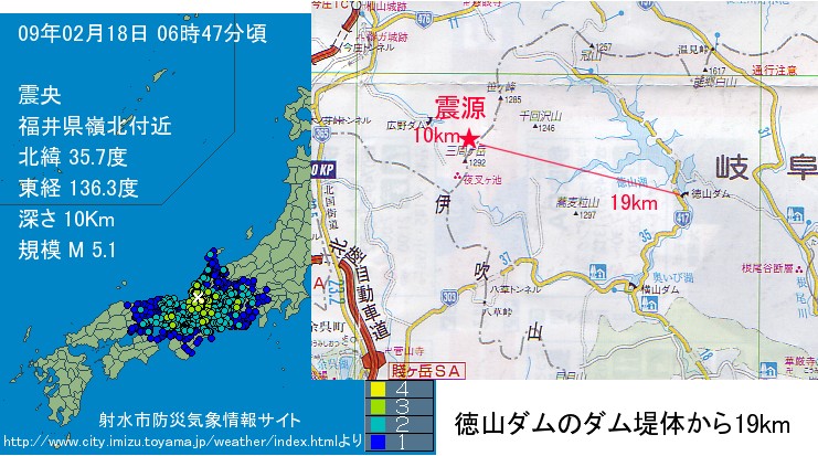 | 1561 2009-02-18 (Wed) 徳山ダム上流部分での地震 先ほど起きた福井嶺北付近の地震は、震源が岐阜県との県境付近にあり、徳山ダムのダムサイトから19km、ダム上流端からは10km程度の位置でした。 ![]() この地震がダム建設の影響であるとは断言できませんが、すくなくとも、太平洋プレートが日本列島の載っているユーラシアプレートを押しているために、それによる歪が蓄積されて起きた地震という認識は捨てたほうがいいと思います。 月面には海も無く、プレート活動もありませんが、地震(月震)が起きています([1417]参照)。完全には冷却し切っていない、内部に熔融マントルが存在していて、その内部で解離層が乱れて地震を起こしていると考えられますが、地球内部にははるかに多い熔融マントルが存在します。その地球マントルの動きに影響を与えるような、大ダムや、地下空間への人工的工作については、解離層を大きく乱すことは無いか、解離ガスを大量に発生させることは無いか、など「地震爆発論」からの検討を加えるべきであります。 追記:M2.5の小さな地震ですが全く同じ場所で起きています。群発地震にならなければいいのですが、ダムの貯水と関係があれば、大きなダムでよく起きる群発地震になる可能性もあります。群発になるようならば、解離層が安定するまでの間は貯水の水位を大きく変化させないように運用することが求められます。 ![]() ![]() |
