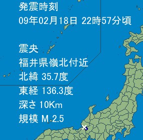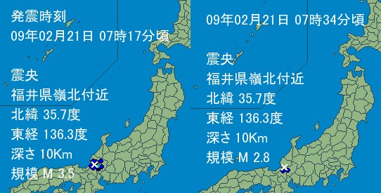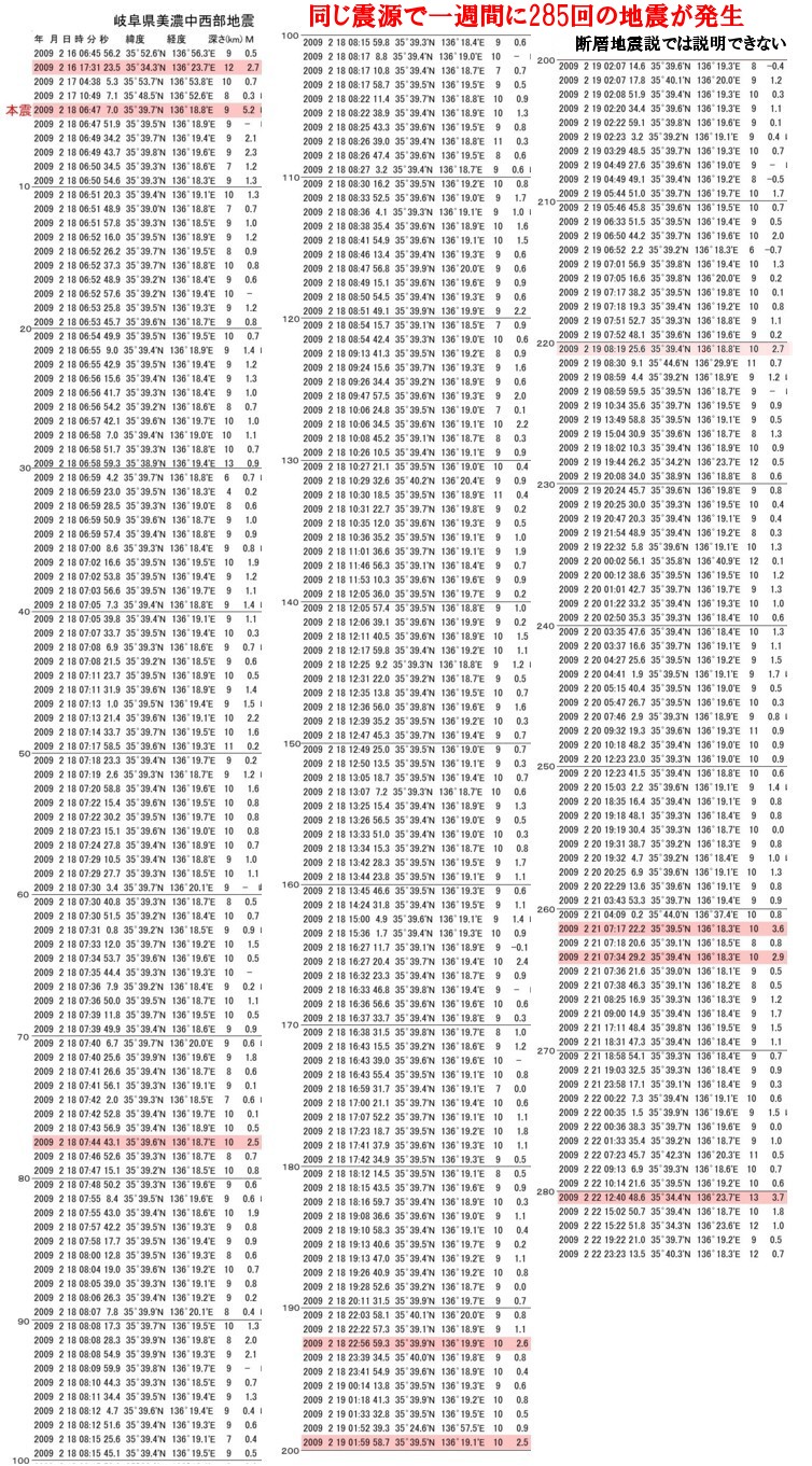 | 1563 2009-02-24 (Tue) 美濃中西部群発地震 [1561]に紹介した福井嶺北付近の地震は美濃中西部域を震源として頻発し、群発地震の様相を示しています。 気象庁が発表している一週間の震源一覧から、この付近の地震を抽出すると一週間に285回もの地震が起きています。 このような地震が歪の蓄積現象から生じるとは思えません。 解離層の不安定化による化学反応現象であることを示しています。 一覧は次に載せておきました。 美濃中西部地震一覧 |