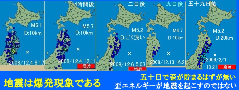 | 1555 2009-02-01 (Sun) 歪エネルギーが地震を起こすのではない 本日18時に宮城県沖でM5.2の地震(深度20km)がありました。 ![]() この地域では[1529]に示したように、深さ10kmで昨年12月にも数回の地震が起きています。最初の地震が起きてから59日しか経っていませんが、このような短時間に歪エネルギーが蓄積されるとは思えません。また五十日間も地震が無かったと言うのは、今回の地震が余震であるという説明では説得力に欠けます。 地震は水が地下の熔融マグマから放出される熱によって解離した解離ガスの爆発現象であって、歪エネルギーが地震を起こしているのではないことを、関係者に早く認識していただきたいと思います。 |