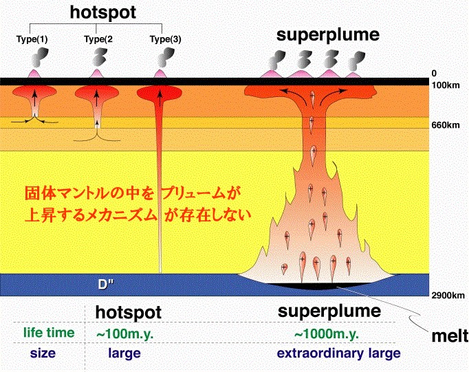 | 1551 2009-01-21 (Wed) 最新のホットスポット論? Nemo氏の主張はこのセミナーが古い資料を使って地磁気の縞模様を議論しているとか、偏ったホットスポット観に基づいてプレート論の批判をしているということでした。学問は日進月歩を続けているし、プレートの移動を示す証拠は山積しており、指摘された件でプレートテクトニクスが否定されるものではない・・・というものでした。そして新地震学ではなく、旧地震学だ、古い地球観のアンシャン・レジームに戻そうとする復古運動だと決め付けておられます。 地磁気の縞模様の件は氏の誤解であることを述べましたが、ホットスポットに関する件で(最新の研究なのかどうかは不明ですが)ネットで調べてみました。 次図は広島大学大学院総合科学研究科「地球資源論研究室」の下記サイト http://home.hiroshima-u.ac.jp/er/index.html に載っていたものです。図中の日本語はセミナー担当者が書き加えたものです。 ![]() 広島大学大学院総合科学研究科「地球資源論研究室」サイトより ![]() 広島大学大学院総合科学研究科「地球資源論研究室」のサイト http://home.hiroshima-u.ac.jp/er/index.html より 火山のマグマは海嶺と海溝とホットスポットでしか生成・供給されないことになっていますが、ホットスポットにも三種類あり、さらにスーパープリュームというものからも供給されるというのが新しい解釈のようです。 しかし、固体マントルの内部をどのようなメカニズムで上昇するのか、タイプ1と2のホットスポットはどのような仕組みで固体マントルから生成されるのか、単なる寓話のようで、メカニズムが存在しないのではないかと思います。 マントル熔融論の立場でなら、スーパープリュームのようなものはマントルの対流として説明が出来ます。また、地殻内部のマグマの流れは、熔融マントルから上昇する熱で岩盤が融解し、火道が出来るという説明が可能です。 下段の図では、潜り込んだ海洋プレートがスタグナントスラブを作り、それが千切れてメガリスとなるということですが、この話にも説得性がないように感じます。固体であるプレートが固体であるマントルの中を千切れて落下していくという話はどう考えても寓話としか思えません。 マントル熔融論では対流としての下降流が存在し、下降流の一部に深発地震面という帯状の一帯を形成する話になります。 [1203] 映画「日本沈没」の解説からでも紹介しましたが、スラブの動きを計算機でシミュレーションしている吉岡祥一・九州大助教授は「スタグナントスラブが切れ落ちるところまで模擬するのは工夫がいる。」と話しています。かなり工夫をしないと、このような計算結果は得られないようです。数値とか係数とかを少し変えるだけでシミュレーションというものはどうにでも変化することは数値計算をやったことがある人には自明の事柄であります。計算機が出した結果を全てが真実であるかのように受け取ることは危険であります。 このセミナーで7年間にわたって展開してきたことがアンシャン・レジームに戻そうとする復古運動なのか、全く新しい地球観の創造運動なのか、それは時代を経ないとわからないことだと思います。 |