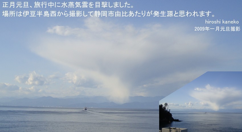 | 1556 2009-02-02 (Mon) 水蒸気雲の写真情報 “水蒸気雲”の写真情報を読者から送って頂きました。今年の元旦に西伊豆から静岡・由比方面を撮ったものですが、由比地区近辺の陸上に水蒸気の上昇による雲らしきものが見えています。 ![]() 水蒸気らしきものは低い丘陵の奥から出ていますから、推定すると図に示すように、国道52号線周辺の一角のように思われます。 ![]() これと類似した現象は伊豆東方沖群発地震が始まる前にも伊東沖で観察されています。 写真の水蒸気雲らしいものが地震の前兆であるのかどうかは分かりませんが、伊豆東方沖の場合は5ヶ月後に手石海丘で海底爆発が起きていますから、5月くらいまでは注意しておいたほうがいいと思います。 地震前兆である可能性もありますが、そうであるなら、地下水の水位変化や、コンパス異常、電磁波異常、水素濃度の上昇、といった現象も現れるはずですから、科学的な計測とつき合わせて総合的に判断する必要があります。またこの地区に居られる方が宏観現象に関心を持って注意して観察していただくことを願っています。 地震と雲の関係に関しては、セミナー[986]に述べましたように、それだけで判断することは非常に難しいことを経験上感じております。 また、本日浅間山が噴火し、活動を始めたようですが、富士火山帯の地下深部でマグマの移動が起こっていることが解離ガスの発生を促しているのかも知れません。浅間山は那須火山帯と富士火山帯の交点付近に位置しますが、岩手宮城内陸地震など東北の地震活動も那須火山帯地下でのマグマ移動が影響していることが考えられます。 ![]() 定説によると日本での火山のマグマ生成はプレートの潜り込みが原因である([1536]、[1541])とされていますので、火山の地下でマグマが水平に移動することは想像し難いですが、石田理論ではマントルは熔融していると考えていますので、火山のマグマも地下では連結していて、水平方向に移動することも可能です。 火山活動が活発化してきている可能性、つまりマグマの移動が起こっているという意味ですが、その一環として由比地区に“水蒸気雲”が現れているという見方もできます。 断層地震説では“水蒸気雲”などの現象を地震と関連させて理解することができませんが、地震理論も“チェンジ”して爆発と言う観点から考えていただきたいと思います。 |
