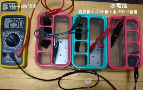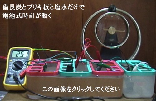 | 1569 2009-03-16 (Mon) 水に関する新しい技術(続き) 玩具の招き猫が無かったので電池式の時計が動くかどうかを確かめてみました。テスターでは3ボルトあっても、時計は動きませんでした。電流量が少ないからのようです。そこで、「水電池」を5セットに増やし、水に食塩を溶かしてみました。時計に接続しないときは4.5ボルト程度あります。時計に接続すると2.5ボルト程度に電圧の降下がありますが、時計は見事に安定して動き出しました。現在一時間以上経過しましたが、安定して動いています。動画でご覧ください。 ![]() |
