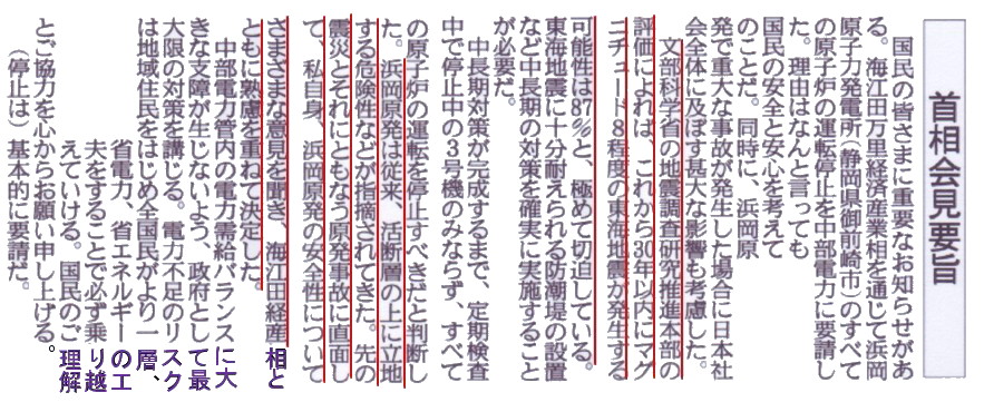 | 1659 Date: 2011-05-07 (Sat) 総理大臣の判断を誤らせる地震学 昨日の菅総理大臣の「浜岡原発停止要請」には驚きました。政治的な見解は差し控えても、正しい地震科学の知識に基づく検討の結果として、誤謬がありますので指摘しておきます。 ![]() @30年以内にマグニチュード8程度の東海地震が発生する確率は87%と、きわめて切迫している。 A浜岡原発は従来、活断層の上に立地する危険性などが指摘されてきた。 B先の震災とそれにともなう原発事故 私は、次世代のエネルギー開発が軌道に乗るまでは、原発も併用していくべきである、そのための安全対策(特に津波対策)を講じるべきであると考えております。 |