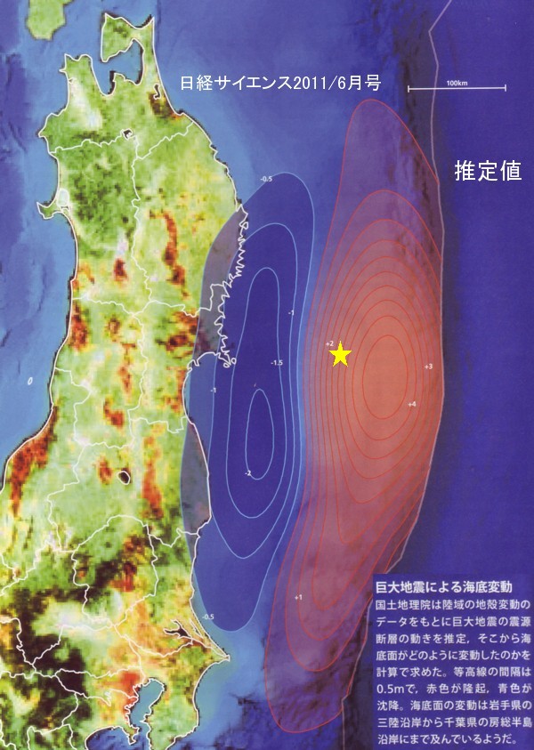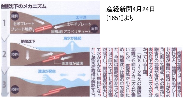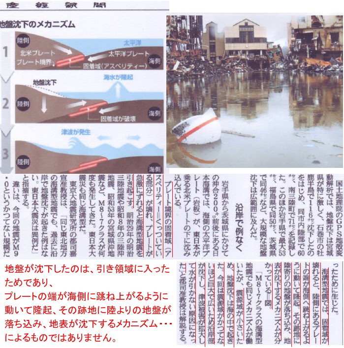 | 1651 Date: 2011-04-25 (Mon) 地盤沈下は引き領域に該当することが原因である 4月24日の産経新聞に、東北沿岸域で地盤の沈下が起き、海水が引かない状態になっていること、そして地盤沈下が起きた原因に関して解説がありました。プレート論と固着域という概念から説明していますが、とても納得できるものではありません。 ![]() だいいち固着域があることと、摩擦熱によってマグマが発生するという説明とは矛盾するはずです。固着域などがあって、どうして岩石を融解させるほどの熱を出す激しい摩擦が起こりえるのでしょうか。また、岩石固着域の周囲はズルズル滑るという着想自体に問題を含んでいます。両者の境界にはどんどん亀裂が出来てしまうはずです。 また、固着域のピンが外れて海側に移動し、そこに跡地ができて、地盤が落下する・・・という着想もおよそ科学的な視点とは言えないと思います。これではまるでプレートとは「こんにゃく板」のようなものであると言っているようなもので、「思いつき地震学」と言われてしまうのではないでしょうか。 この「こんにゃく板」のような挙動をする剛体プレートという考え方は、スマトラ沖地震での地盤沈下にも適用されていました(ニューオフィス46)。マスコミで何度も繰り返される解説ですので、地震爆発論の立場からも何度も発信しないといけないと考え、繰り返しになりますが解説しておきます。 |