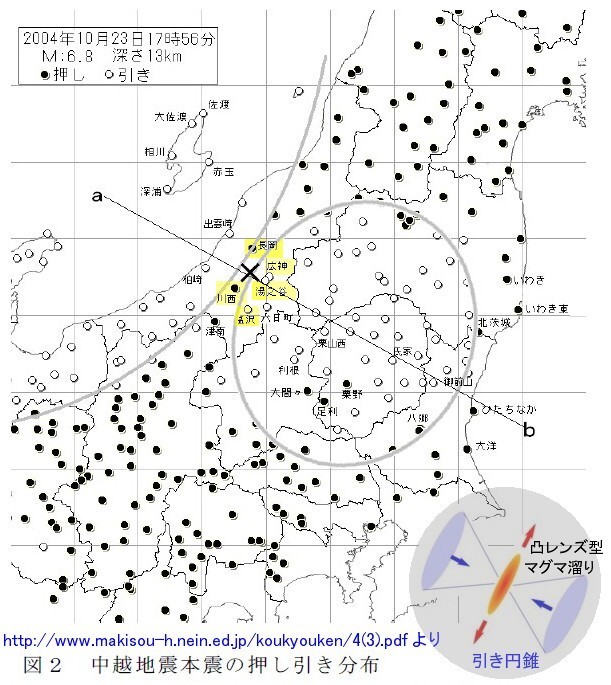 | 1653 Date: 2011-04-27 (Wed) 「引き円錐」になる特殊なケース フンボルトを祖とする石本博士らの「押し円錐理論」が廃れてしまった一つの理由に、押し円錐では説明できない例外が見つかったということがあります、浜野一彦著「地震の話」から紹介します。 ーーーーーーーーーーーーーーーーーーーーーーーーーーーーーーーーーーーーー 地震の原因 古いところでは紀元前三八四〜三二二年のアリストテレスの地、水、火、風の結合があるが、近代地震学としては東大教授小藤文次郎の“断層地震説”が最初である。明治二十四年の濃尾大地震の根尾谷断層がこの原因説を実証することになり、世界的にも高く評価された。 その後は必ずしも大地震に際して断層が発見されるとは限らず、とくに大正十二年の関東大地震を契機としてジウスに始まった“断層地震説”は批判され、フンボルトの“岩しょう地震説”が注目されることになった。 初代地震研究所長の石本巳四雄は“岩しょう流動説”を提唱した。石本の説は地震波の性質と岩しょうの貫入との関係を無理なく説明した。正にすべての地震は岩しょう流動説によって説明されるかに見えたが、これものちに例外の存在が判明した。 その後、昭和十五年石本已四雄がこの世を去って以来、地震原因論の混沌時代が続いた。 昭和二十年太平洋戦争が終って地震学が近代化され、ウェゲナーの大陸漂移説の見直しとともに、プレートテクトニクスが地震学の主流を占め、“断層地震論”が再び脚光を浴びることになった。 最近、電波研究所の観測でハワイ諸島と日本列島とが一年四センチの速さで近づきつつある、という発表とか、日本海溝の最深部で地震が起こっていないという観測結果の発表があったりして、プレートテクトニクスの矛盾がそろそろ出てきたと思うが、それはそれ、辻褄合せがされているようである。 ーーーーーーーーーーーーーーーーーーーーーーーーーーーーーーーーーーーーー 例外的ケースを明確に説明し得なかったことが「押し円錐理論」が消えていった理由のようですが、誠に残念なことだと思います。押し円錐の内部と外部が逆転し、内部が引き領域に、外部が押し領域になる理由、つまり「引き円錐」になることもある理由が説明できれば、「押し円錐理論」の有効性は確保されたはずで、残念なことです。 ではここで、この例外的な「引き円錐」のケースを説明します。図に示すように、「引き円錐」になるのは、マグマ溜りが平たいレンズ状、又は海の人手状になっている場合です。 このとき、解離ガスの爆発はレンズの端方向に向かって360度方向に発生し、レンズの面と垂直方向に引き領域が形成されます。したがって、円錐の内部が引き領域になります。マグマ溜りは通常は“きゅうり”か“サツマイモ”的な形状ですが、特殊なケースでは“レンズ”とか“ひとで”のような形状にもなるはずです。そうした場所で解離ガスが貯留され、爆発が起きているのが、「引き円錐」となる理由です。「押し円錐」はレギュラータイプ、「引き円錐」はイレギュラータイプと考えれば、「押し円錐理論」の基本的な有効性は失われないことになります。 追記: [3142]に爆発理論の修正(シンプル化)が載っています。 |