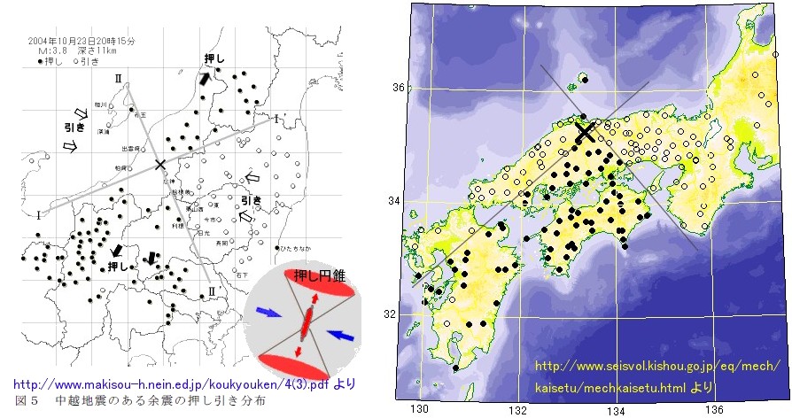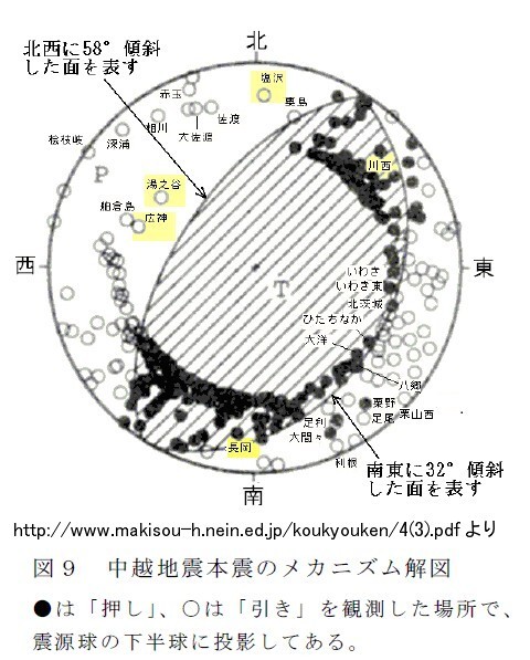 | 1657 Date: 2011-05-05 (Thu) CMT解への疑問 再度以下のようなメールをいただきました。 「丁寧な解説ありがとうございます。ところで調べてみますと、地震の象限型分布は定説の断層破壊で説明できているとされているようですが、私にはどうしても納得ができません。断層の破壊によって押し引きのパターンが4象限に分布したり、あるいは双曲線型になったりするというのは、どうしても視覚イメージで無理があるように感じます。その点、先生の押し円錐の理論は視覚イメージでほぼ納得できるものがあります。今度は定説での押し引き分布の説明に無理があることを分かりやすく解説していただけませんでしょうか?事実、今回の震源域でも国土地理院の調査によると、震源を中心とした大きな双曲線のような地殻の移動が認められていますが、それを数百キロの断層破壊で説明するのはどうしても無理があるように思われるのですが。」 以上がその内容です。地震時に現れる初動の押し引き分布は、4象限型、楕円型、双曲線型の3種類に分類されますが、断層破壊にその原因を求めることは確かに視覚イメージ的に無理があります。3種類を説明するために生まれたのが「押し円錐理論」でありますが、詳細はニューオフィス48に解説してあります。 さて、メール文にあります東北地震の海底変動に“双曲線のような移動”というデータが見つかりませんので、要望に応えられないかもしれませんが、象限型(ニューオフィス48の図ー1にあるB図)で全てが表示可能であるとされている定説についての疑問を述べてみます。 ![]() 黄色でマークした震源付近の、長岡、川西が「押し」、広神、湯之谷、塩沢が「引き」となっています。この押し引き分布は“押し円錐”では説明できない“引き円錐”になっています。震源付近に凸レンズ型のマグマ溜りがあって、その中で解離ガスが貯留され、地震という爆発が起きたものと推定されます。しかも、“引き円錐”の軸は震源で折れ曲がり、左右対称にはなっていないケースのようです。また、円錐の頂角も東南方向の円錐は狭く(90度以下)、北東方向のものは広い(90度以上)ようです。マグマ溜りの形状で円錐の形状は様々なケースに分かれることがあり得ます。 ![]() たしかに、象限型で表示できているように見えますが、表示が出来たとしても、この表現形式でどのような地震現象解明の手掛かりがあるのか理解できません。押し円錐、引き円錐の区別も出来ません。図中に「北西に58度傾斜した面」と「南東に32度傾斜した面」とありますが、解説によればどちらかが断層面に相当するはずであるが、どちらになるのかは決定はできないということだそうです。 ![]() このように、“押し円錐”または“引き円錐”でならば、地殻内部で起きている現象を物理的に解釈することができますが、CMT解なるものではなぜ初動の押し引き分布が3通りに分かれるのかの説明もできませんし、断層が動くことが地震であるという説明にも説得性がありません。 これらは震源が浅く、“押し円錐”の軸が水平の場合の起きるケースです。 最後になりますが、CMT解に関して気象庁のサイトには、 制度が良い・・・ということは、断層地震説で説明するのに都合の良い・・ということであり、都合のいいデータのみ掲載する・・ということではないのでしょうか。気象庁のこの姿勢は研究者の姿勢としては大きな問題を含んでいると思います。 |