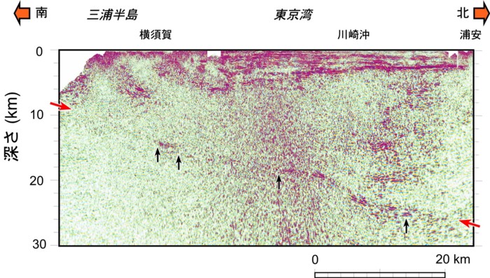 | 1654 Date: 2011-04-29 (Fri) 東北地震による海底変動 独立行政法人海洋研究開発機構による「東北地方太平洋沖地震に伴う震源域近傍における海底変動」が速報として発表されました。 http://www.jamstec.go.jp/j/about/press_release/20110428/ それによると、図に示すように[1643]で解説した最初の地震爆発@の震源と海溝軸の間で海底地盤が大きく隆起していることが分かります。オレンジ色は20〜30mの隆起ですから、やはり、@の東南東で起きたと推定されるAの爆発のほうが激しく地盤を隆起させたものと思われます。星印の震源でも隆起しているのは、@の爆発によるものであり、東北の沿岸一帯が沈下しているのは、@、Aともに引き領域になったからであると推定できます。 ![]() 図中には海溝軸のすぐ西側で地滑りが発生したという記入がありますが、これは2008年の岩手・宮城内陸地震で発生した荒砥沢ダム北部大陥没の状況とよく似ています。荒砥沢ダムの崩落は震源付近で観測された4000ガルという大きな加速度によって、発生したものですが、今回も海底において巨大爆発が起こり、それによる大きな加速度によって崩落したものと思われます。この計測結果からも、Aの爆発のほうが、規模が大きかったのではないかと推測されます。 ![]() どこかでこのような反射法地震探査記録に、プレートが潜り込む面の影響が現れ、プレート論の証明であるかのような説明(注)があった記憶があります。プレート論が正しいのならば、何らかの影響が出るのではないでしょうか。現れない理由をどなたか御教示ください。 注:地震学会の機関紙「なゐふる第51号(2005年9月発行)」に載っていました。 ![]() 三浦半島南端から東京湾を経て浦安にいたる反射法地震探査断面。東京真下に沈み込んでいるフィリピン海プレート上面が、北に向かって傾き下がる反射層(赤矢印)として深さ26km程度まで明瞭に見えています。黒い矢印の部分は、反射が明瞭な部分です。 |