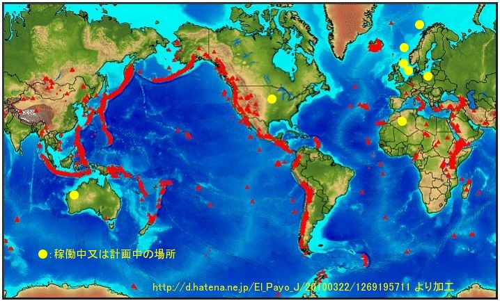 ![]() ネットの世界では、これが3・11東北M9.0地震のあとに起きた4・11地震および、その後に頻発しているこの地域の余震の原因ではないのかと騒ぎになっているようです。 ![]() 赤色は火山または火山帯をしめす。稼働中または計画中のサイトは全て火山帯から離れている。 日本は火山帯の上にあり、CO2の地中封入には適していない。 最近始まったドイツの封入現場も含めて、全てが火山活動からは無縁の場所にあることが分かります。液化炭酸ガスの地下封入という方法は日本のように火山活動が活発で、解離層が浅いところにある場所では採用するべきではないことを認識する必要があります。 |