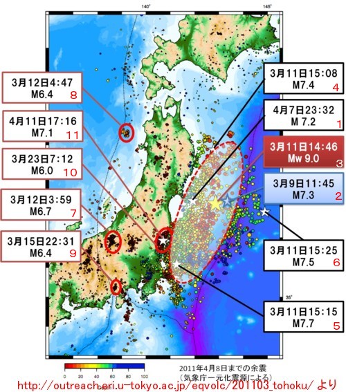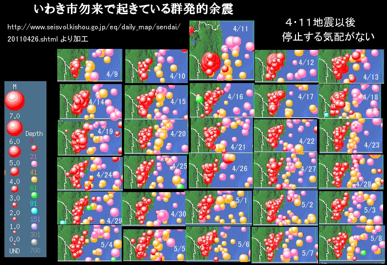 ![]() 新潟県長岡での試し実験から本格的な実験に移行したということです。しかし、[1662]で解説したように大学教授でもその危険性に気付いておられないですから、現場の技術者は何をためらうこともなく効率的な封入技術にしか関心が無いわけです。 しかし、4.11地震の後の起きている余震の発生傾向を見ると、明らかに実験場所の直ぐ真上といっても良い地域で、群発的な地震が起こり3.11地震から2ヶ月、4.11地震からでも一ヶ月の間余震が頻発し、収束する見込みがないかのようです。或いは、[1658]で述べたBの爆発は、4.11地震の震源と同じだったのかもしれません。地震波形からは、Bを単独の地震としてみたときの初期微動を区別することは出来ません。よってBの爆発がどこで起こったのかは特定できませんが、少なくとも勿来の注入現場に近いということは確かです。