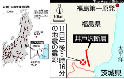 | 1663 2011-05-10 (Tue) いわき市における液化炭酸ガス地中封入実験と群発性地震との関連 [1649]に紹介した4/17付けの朝日新聞では、M9地震の後日本列島への力の掛かり方が変化し、引っ張られるような力によって、正断層型地震が増えたという地震学者の解説がありました。前日の16日には読売新聞が地震学者のコメントとして、「予想外の断層があった」ことが4・11地震の原因だったと次のように報じていました。 ーーーーーーーーーーーーーーーーーーーーーーーーーーーーーーーーーー 先日のM7余震、予想外の井戸沢断層が原因 11日に福島県東部で起きた、東日本大震災の余震とみられるマグニチュード(M)7・0の地震は、大きな地震の発生が予想されていなかった「井戸沢断層」が動いて起きていたことが分かった。 ![]() M9・0の東日本大震災の影響で、内陸部の活断層でも力のかかり具合が変化して地震が起きやすくなっていると見られ、動く確率が低いとされてきた活断層にも警戒が必要だと、専門家は指摘している。