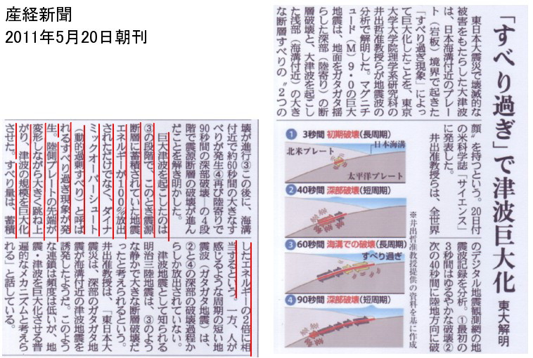 | 1670 2011-05-20 (Fri) 地震学者も東大もいいかげんにしてくれ 東大准教授が今回の地震で起きた巨大津波は「すべり過ぎ現象」が起きたためであることが地震記録から分かった、という研究をアメリカの科学雑誌「サイエンス」に発表したと、今朝の産経新聞が報じています。 ![]() ダイナミックオーバーシュート(動的過剰すべり)なるものが剛体であるはずのプレートで起こるとはとても考えられませんが、それらしいネーミングを付けると、専門外の人には受け入れてもらえるのでしょう。サイエンス誌の権威が疑われてしまいそうです。「地震学者も東大も、いいかげんにしてくれ・・・・」と言いたくなります。 |